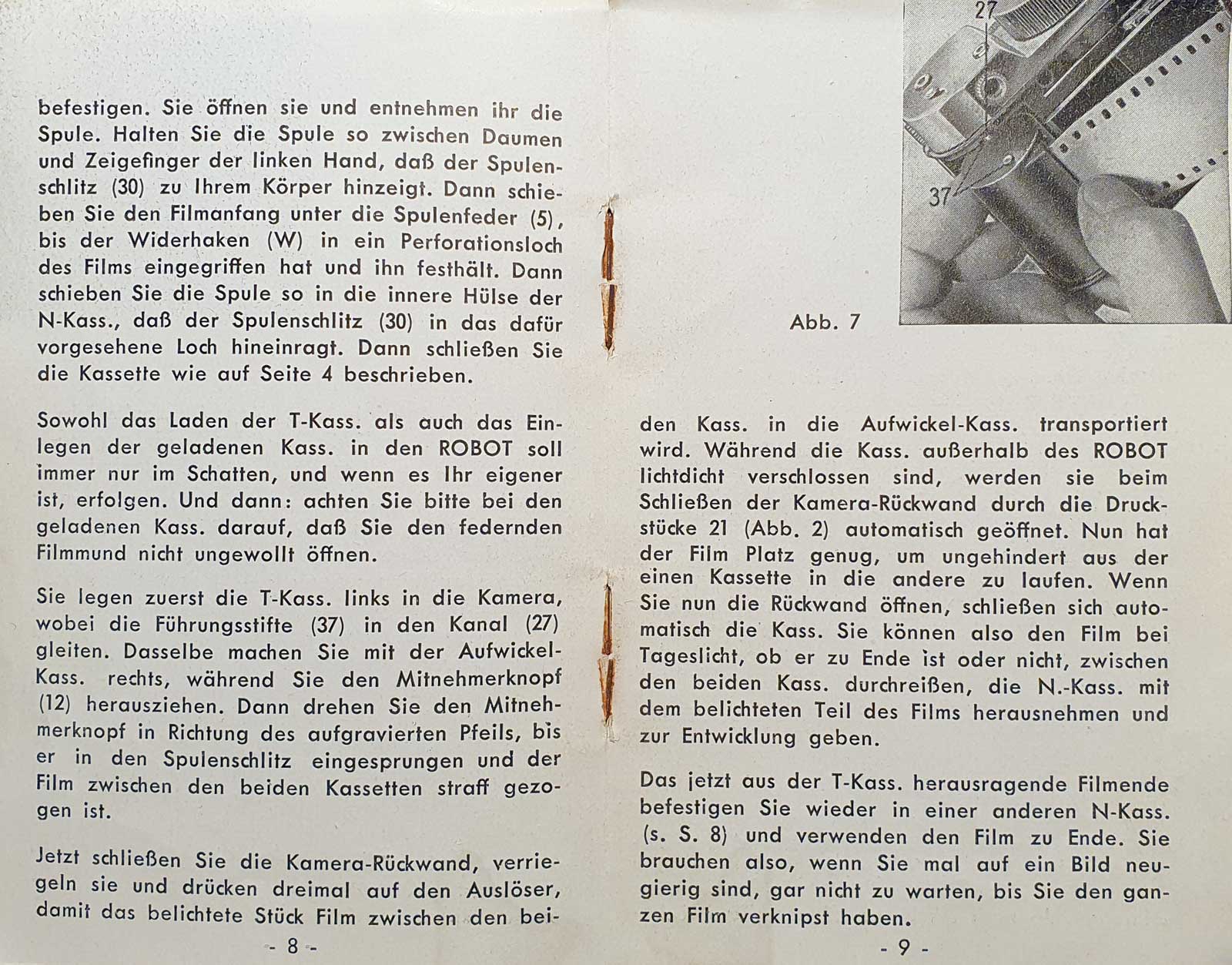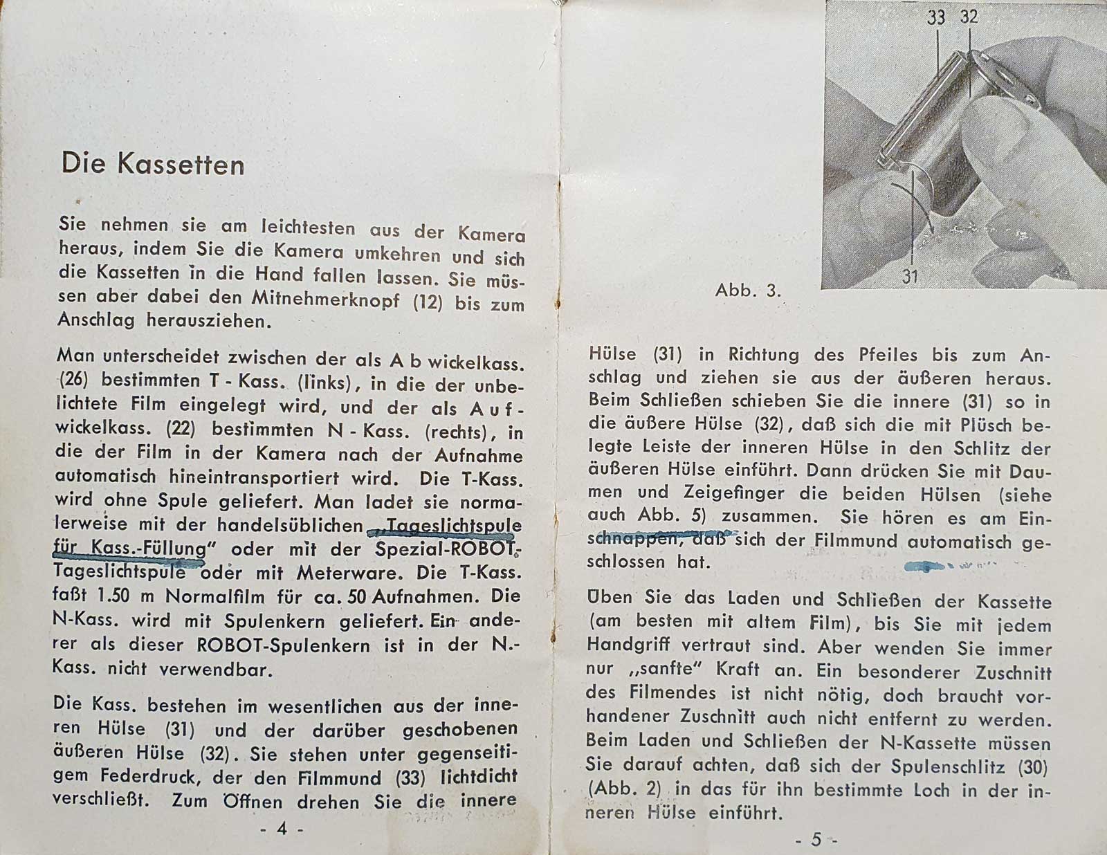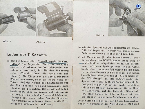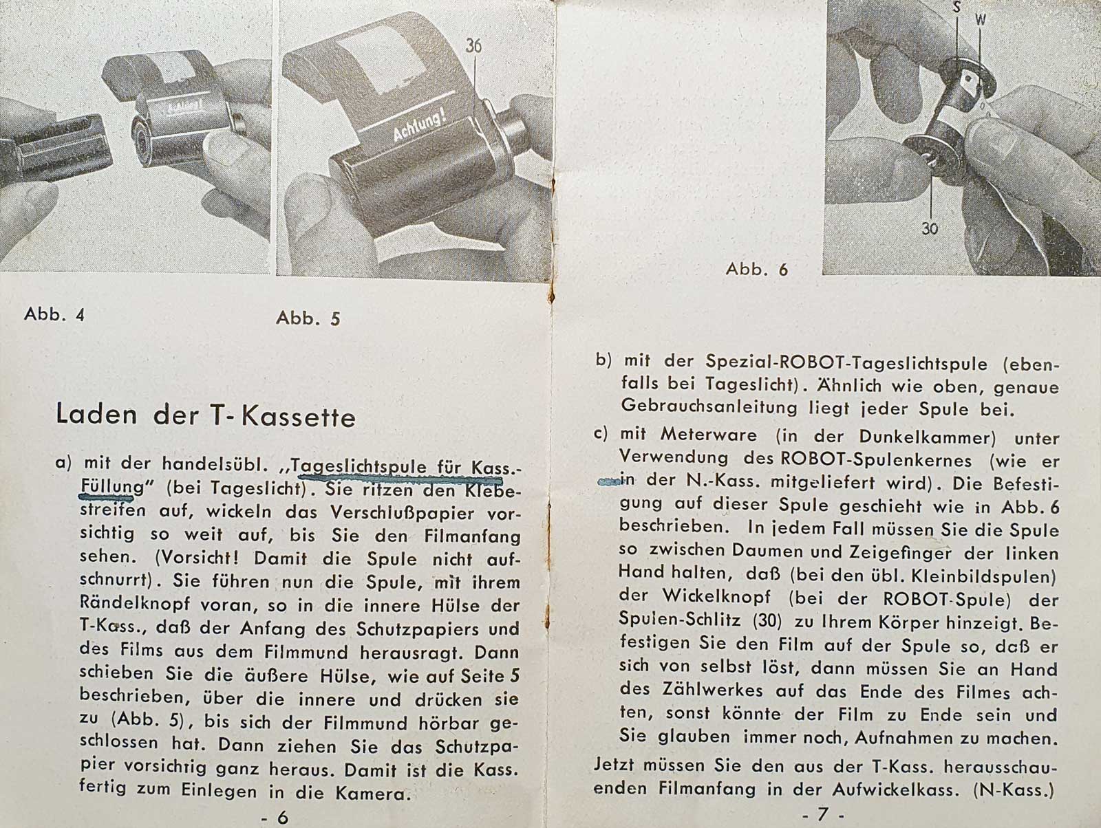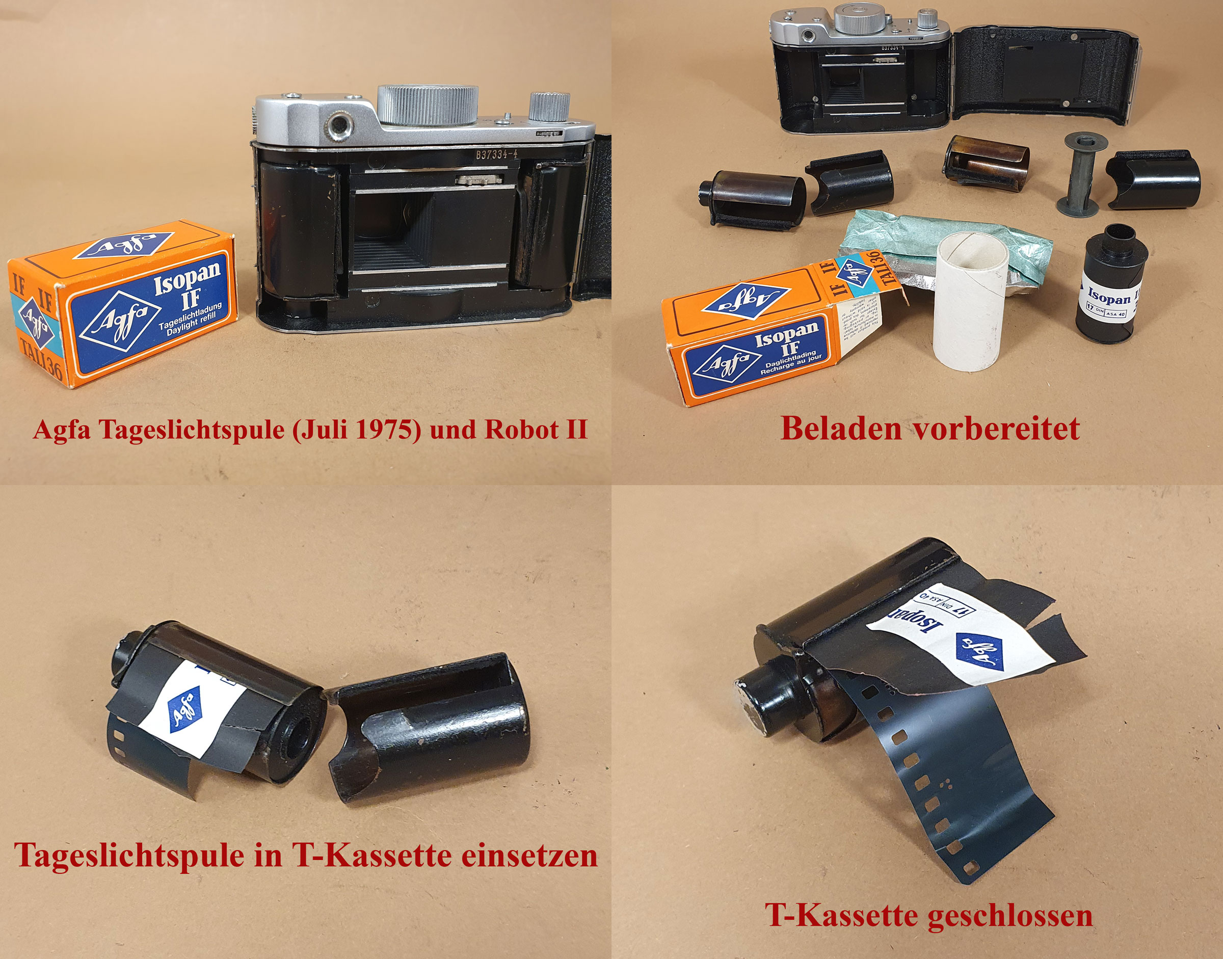 Um den Robot II in heutiger Zeit ganz einfach einsatzbereit zu machen, empfiehlt sich die Verwendung handelsüblicher moderner Kleinbildpatronen. Die Kleinbildpatrone öffnet man im Dunkel, entnimmt die Spule samt Film und setzt die Spule einfach in die T-Kassette ein. Das passt auch bei modernem Filmmaterial wunderbar. Anschließend wird die Kassette wieder verschlossen und der Filmanfang natürlich herausstehen gelassen.