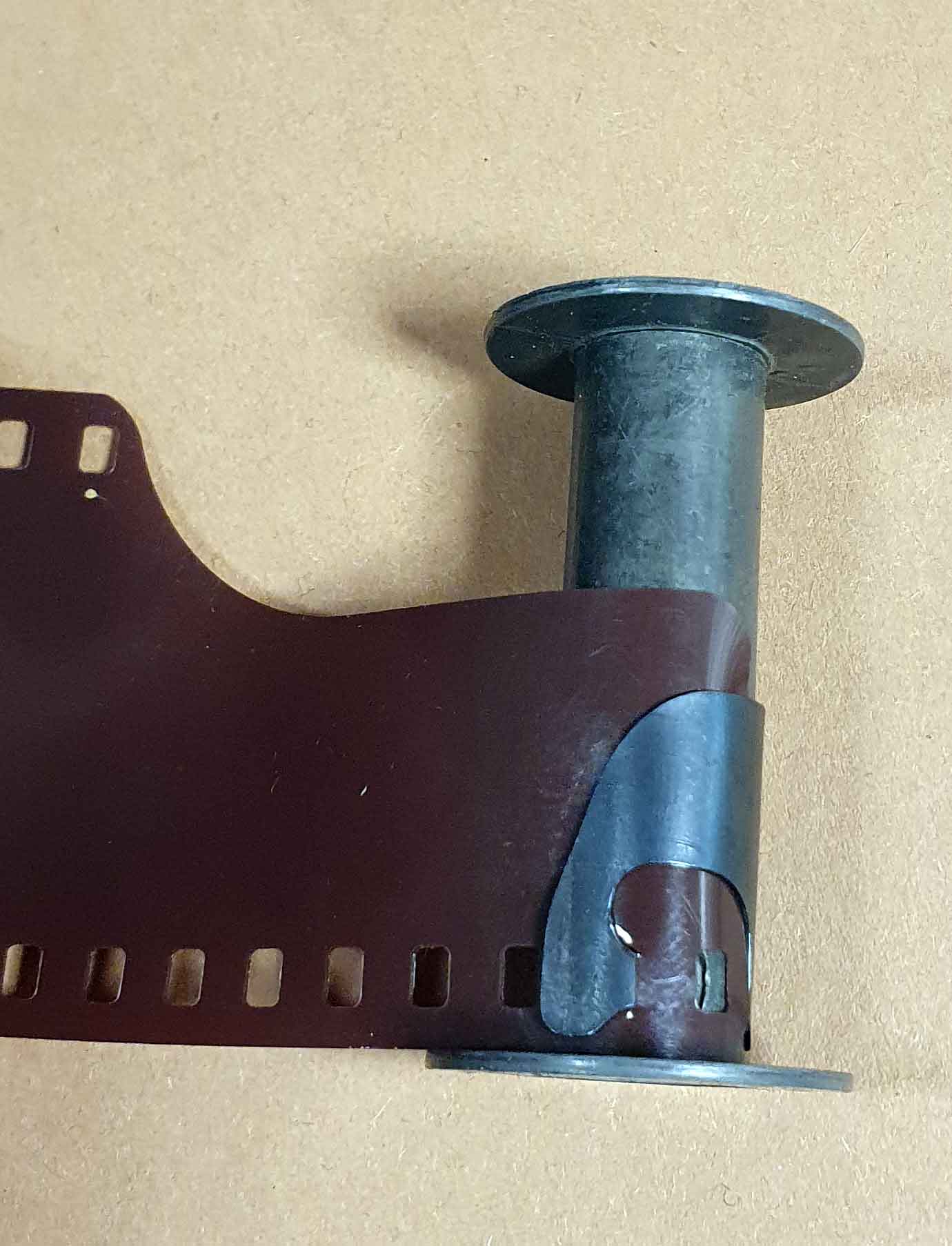 2. Bei Entwicklung im kommerziellen Labor: Film im Dunklen entnehmen und wieder auf die originale (Abwickel-)Spule zurückspulen. Anschließend die Spule wieder in die originale (moderne) Kleinbildpatrone einsetzen, die Patrone verschließen und ab damit ins Labor.