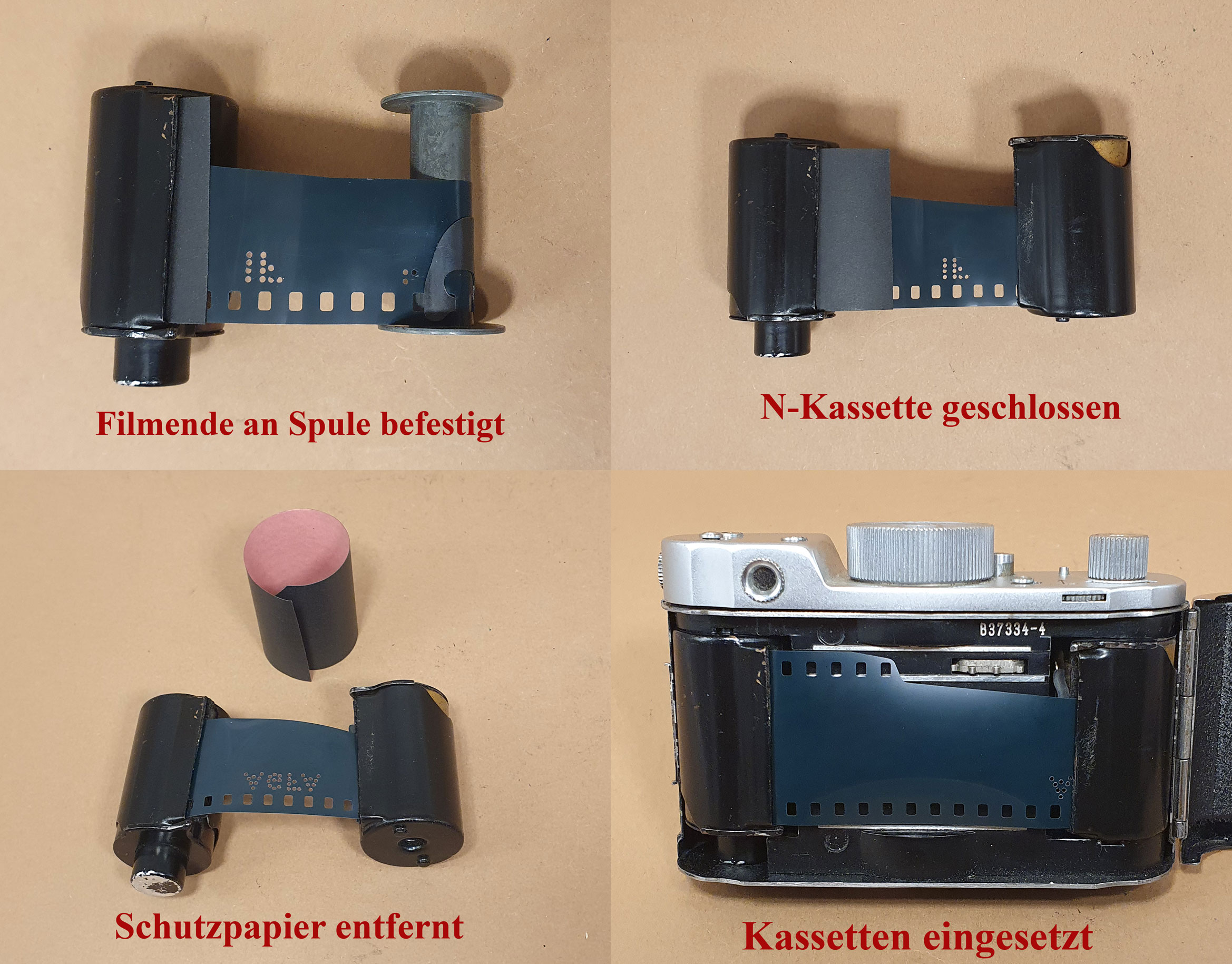 Das Befestigen des Filmanfangs in der N-Kassette kann dann bei Licht erfolgen.