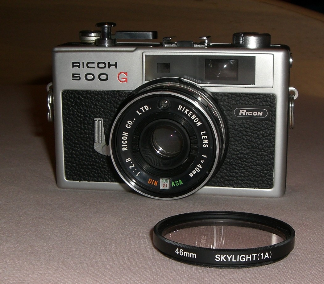 zu meiner Sammlung gehört die Kleinbildkamera Ricoh 500 G Baujahr 1972, Kaufjahr 1973 mit beiliegendem Skylightfilter und folgenden Daten: