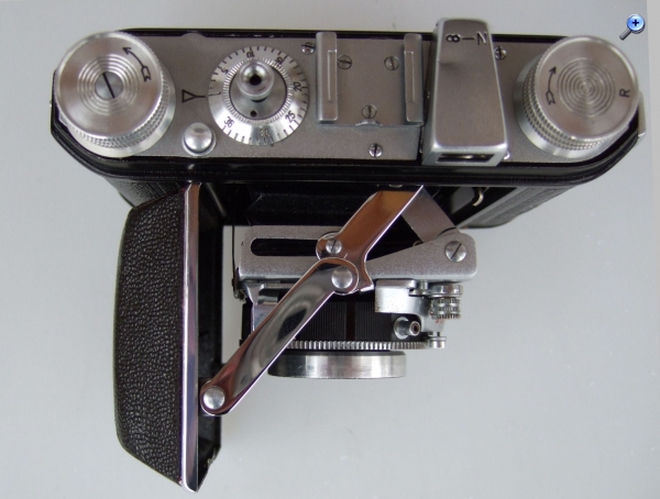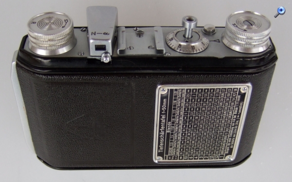 Besonderheiten: Sucher mit Parallaxen-Ausgleich-Einsteller, Tiefenschärfetabelle auf Rückwand. Blitzschuh u. Synchronkontakt. Filmzählwerk. Stativgewinde