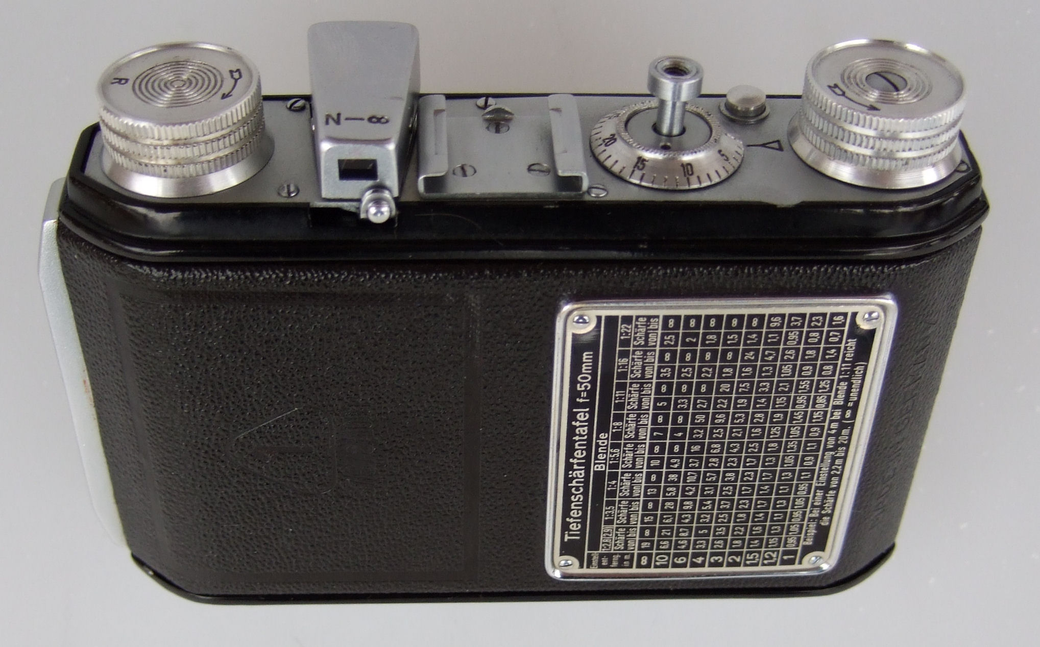 • Besonderheiten: Sucher mit Parallaxen-Ausgleich-Einsteller, Tiefenschärfetabelle auf Rückwand. Blitzschuh u. Synchronkontakt. Filmzählwerk. Stativgewinde