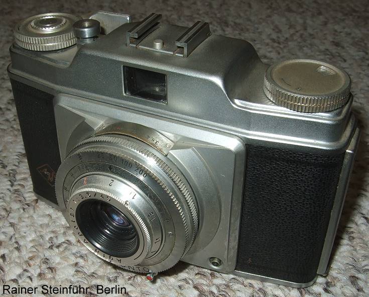 ich kann noch ein etwas späteres Modell der gleichen Kamera beisteuern. Das Apotar 3,5/45 war inzwischen durch ein Color-Apotar 2,8/45 ersetzt worden, und der Verschluss ist leicht modifiziert mit international üblichen Verschlusszeiten statt der deutschen Reihe. Am auffälligsten ist aber der mittlerweile "versenkte" Filmtransporthebel. Das Baujahr ist mir nicht bekannt (1957?) . Alle anderen Daten entsprechen dem älteren Modell, das Rainer oben vorgestellt hat.