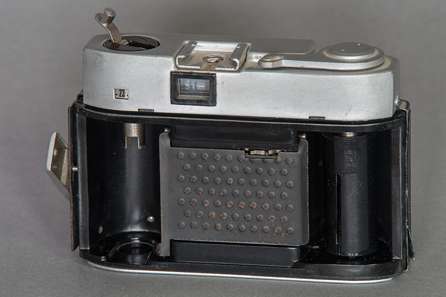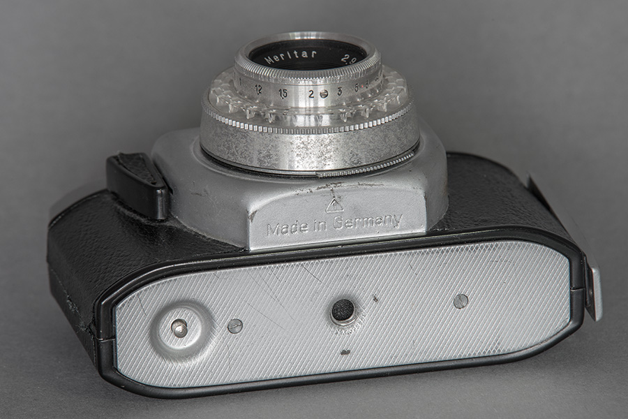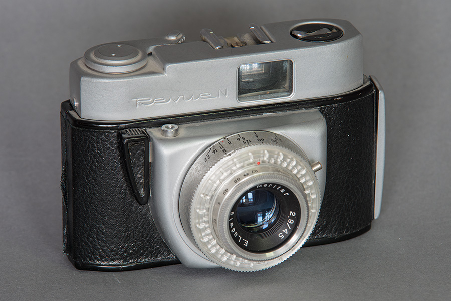 ... war eine der Exportvarianten der Beirette K. Hier eine der sog. 1. Version. Noch mit Kleinbildpatrone 135/36 Bilder aber schon mit "neu" designtem Auslöser und mit Mittenkontakt im Blitzschuh. Das Bildzählwerk lief von 36 auf 0 und beim Filmeinlegen wurde es durch das Anspulen neu gestartet. einen extra Rückstellknopf gibt es nicht. Das 1/4" Stativgewinde, hier noch mittig, rutsche später bei den SL-Modellen an den Rand. Wie bei allen anderen Beiretten gab es auch einen Drahtauslöser-Anschluss, ein Vorlaufwerk war allerdings nicht vorhanden. Als ausschließlich modische Zier kann wohl die "schicke" Plastikblende um das Objektiv verstanden werden. Bei den DDR-Modellen hab ich so etwas noch nicht gesehen. Ansonsten entsprach die Revue N in ihren technischen Daten der Beirette K.