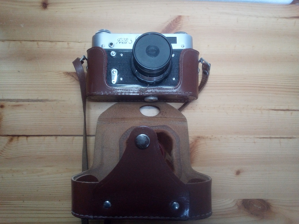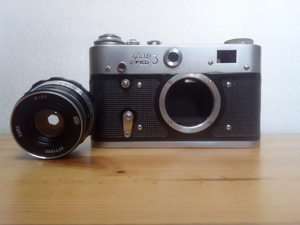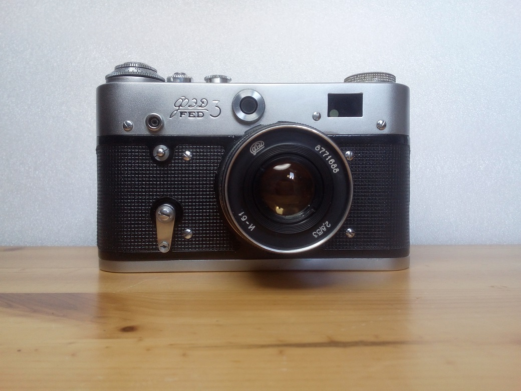 Hersteller: FED, Charkow, ehem. UdSSR Modell: FED-3 Typ: KB-Meßsucherkamera mit gekoppeltem Entfernungsmesser, 24 x 36 mm, max. 36 Aufnahmen, Selbstauslöser Baujahr: 1968 Seriennummer: 8764215 Verschluß: horizontaler Tuchverschluß, "B", 1 - 1/500 sec, Blitz 1/30 sec Blenden: je nach Objektiv (Industar I-61 Blende 2,8 - 16) (verbautes) Objektiv: Industar I-61, 1:2,8 / 53, Seriennummer: 8771688 Fokussierung: manuell, 1 Meter bis unendlich Gewicht (ohne Objektiv): ca 600 Gramm