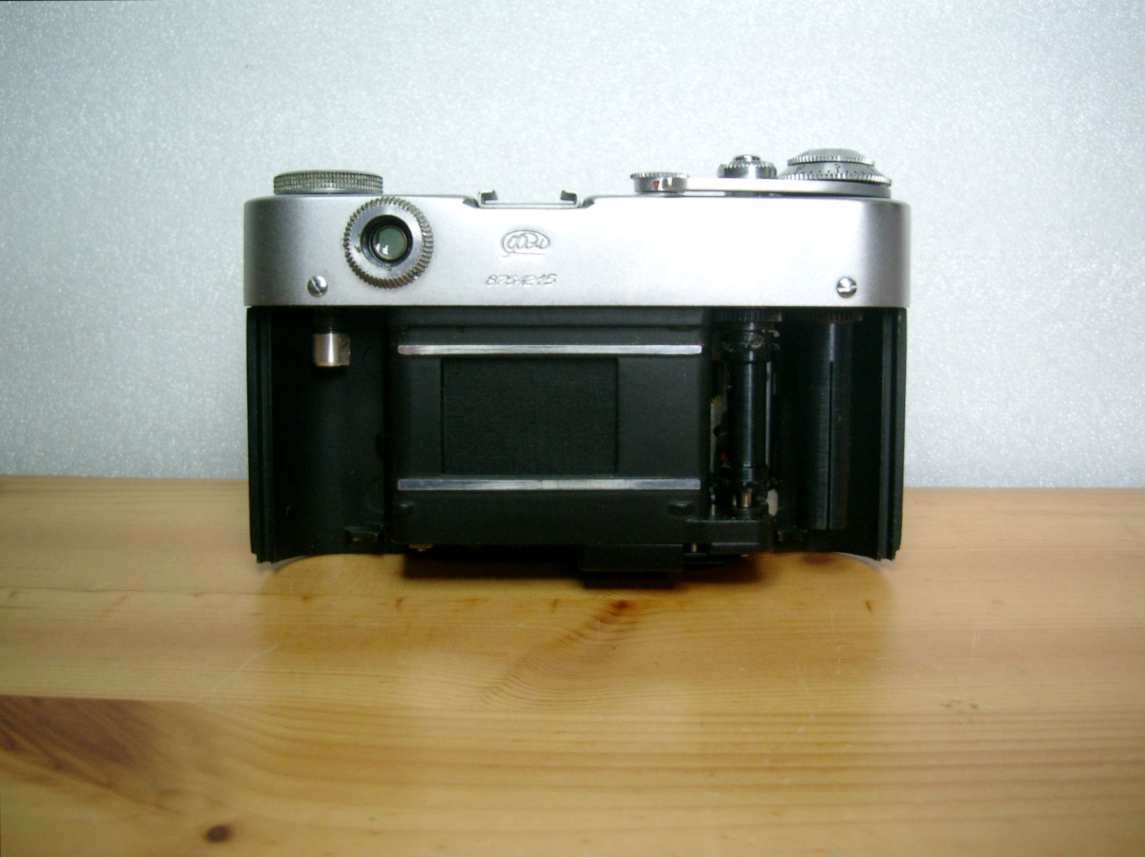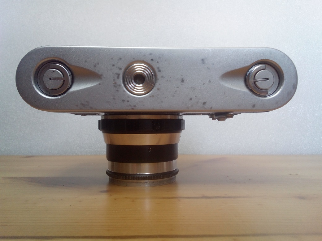 Oberseite: Filmrückspulrad, Blitzschuh ohne Mittenkontakt (PC-Buchse vorne rechts am Gehäusedeckel, Einstellrad für die Verschlußgeschwindigkeit (Zeiten dürfen nur bei gespanntem Verschluß verstellt werden) Auslöser mit Sperre und Drahtauslöseranschluß, Schnellspannhebel, darunter nicht selbstrückstellendes Bildzählwerk, oberhalb des Spannhebels Filmmerkscheibe in GOST