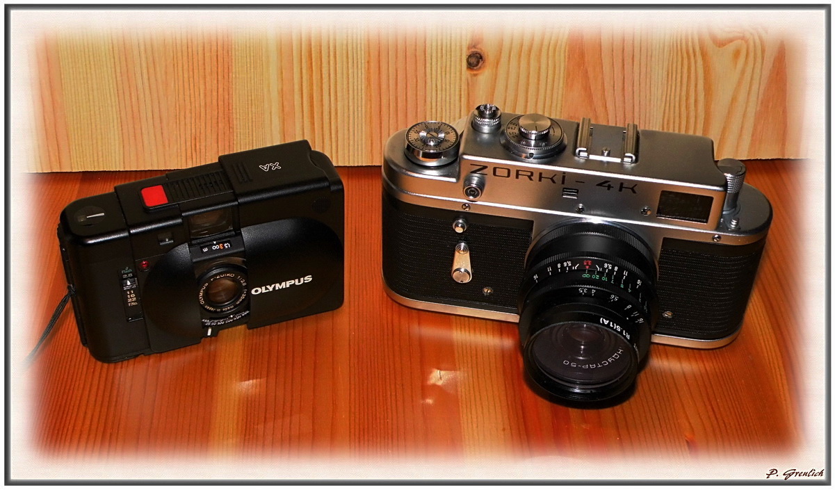 Zum Grössenvergleich zusammen mit einer Olympus XA. An der Zorki dabei ein Industar 50/3.5 von 1975, ebenfalls mit Step Up Ring, diesmal aber mit Skylight Filter