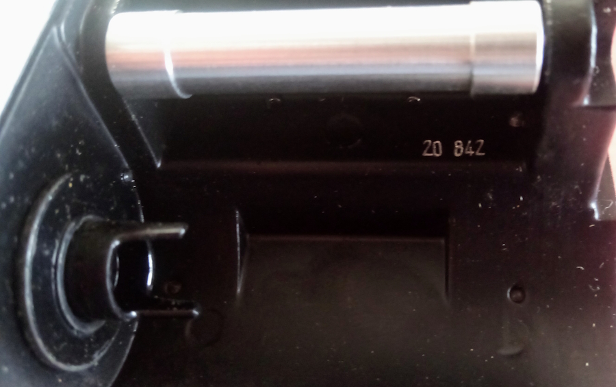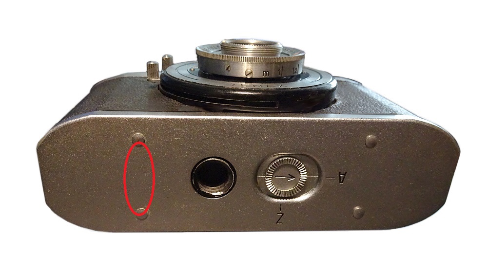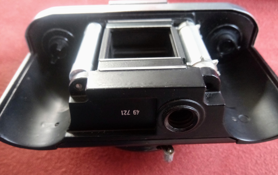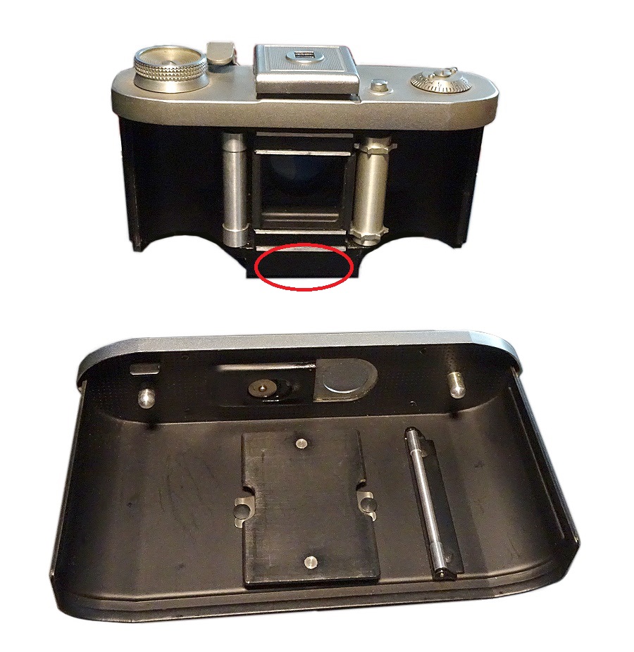 - die Seriennummer ist bei der "alten" Tenax nicht im unteren schmalen Rand der Rückwand zu finden sondern an der markierten Stelle unterhalb der Filmbühne, desweiteren waren der Seriennummer je nach Baujahr ein "H" für 1938, ein "J" für 1938/39 und schließlich "M" für 1940/42 vorangestellt. Vier- oder fünftellige Seriennummern ohne vorangestellten Buchstaben findet man erst bei Nachkriegsprodukten.