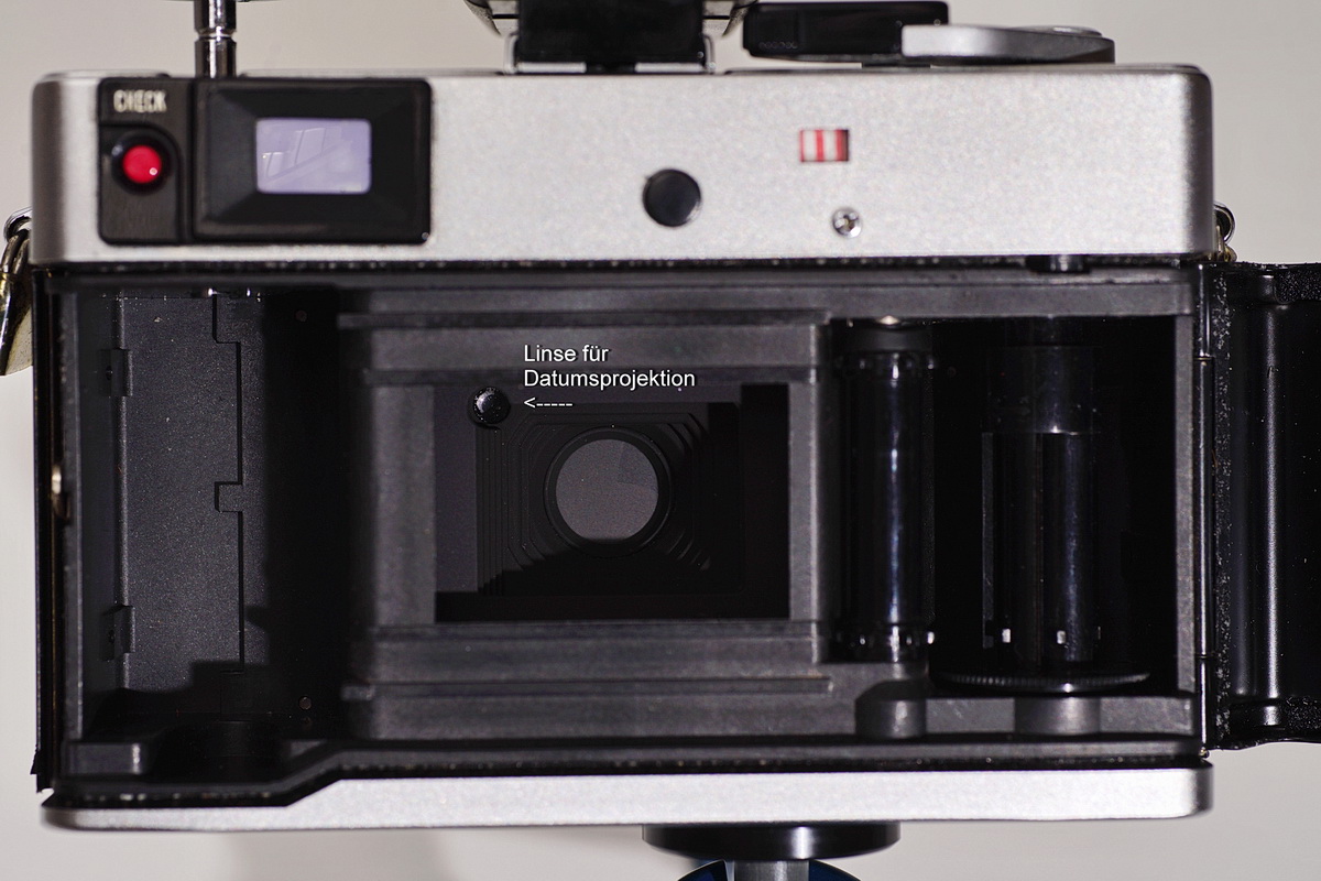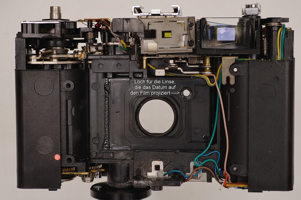 Die Frage, wie wird das Datum einbelichtet, hat mich dazu veranlasst, eine defekte Kamera zu ersteigern. Diese habe ich teilweise zerlegt.
