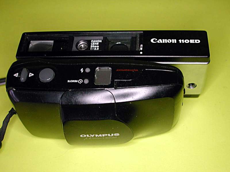 Hier die Olympus mju Zoom, Format 24x36mm, mit Elektronenblitz, 220 Gramm, neben der Canon 110ED, Festbrennweite, Format 13x17mm, mit Hotshoe, 295 Gramm: