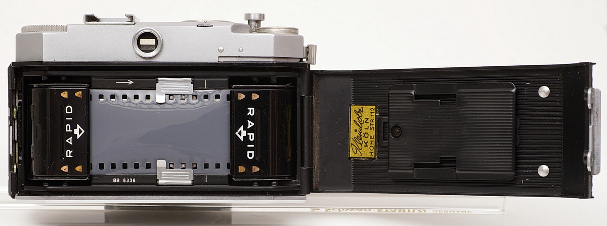 • Belichtungssystem: T (Hilfshebel), B, 1 bis 1/500 Sek. , Vorspannhebel