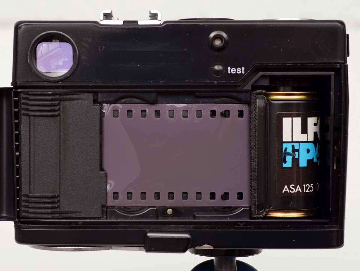 • Filmtransport: SchwenkHebel. Der Film liegt halbwegs lichtsicher auch im schon belichteten Zustand ausserhalb der Patrone.