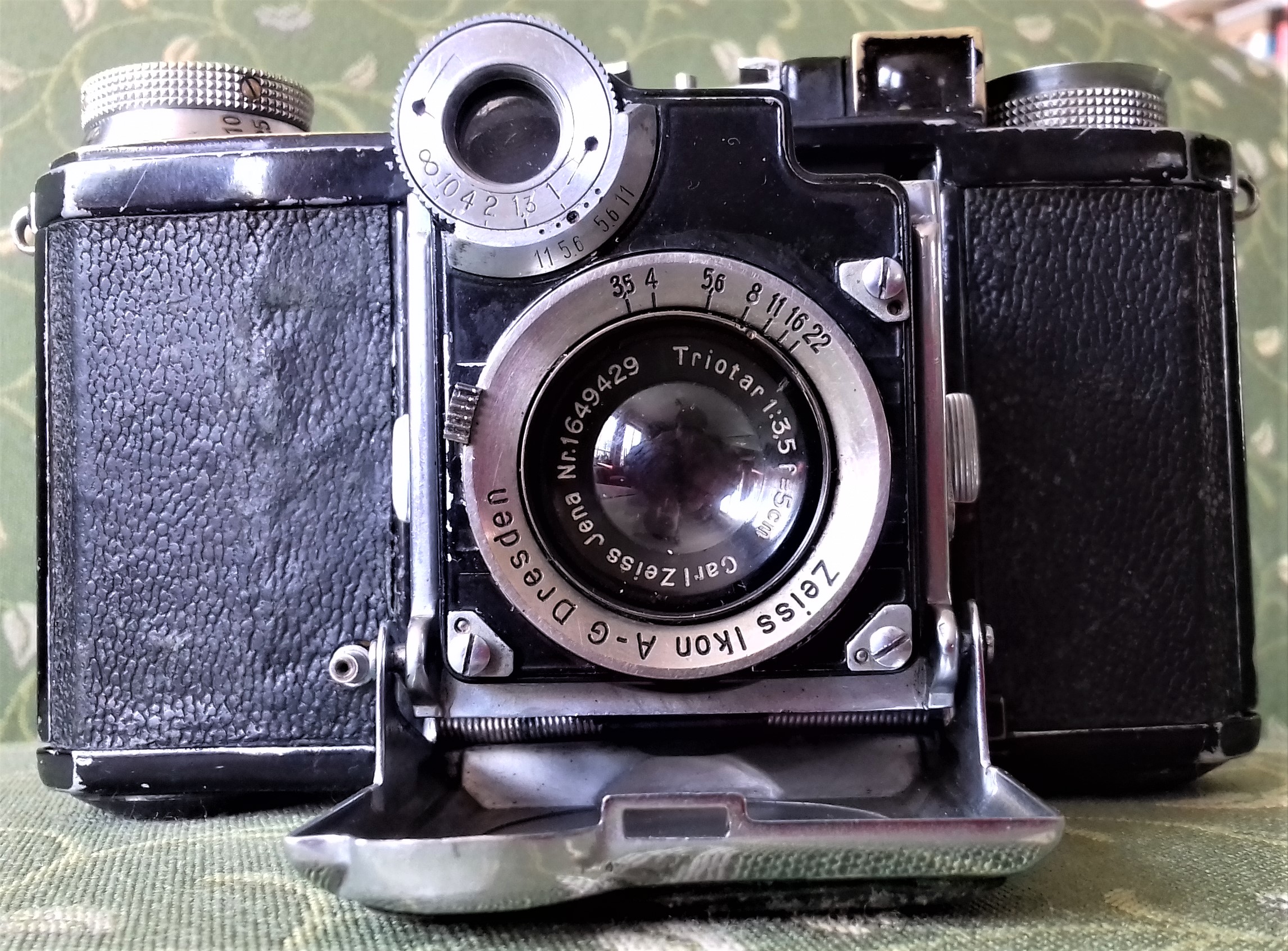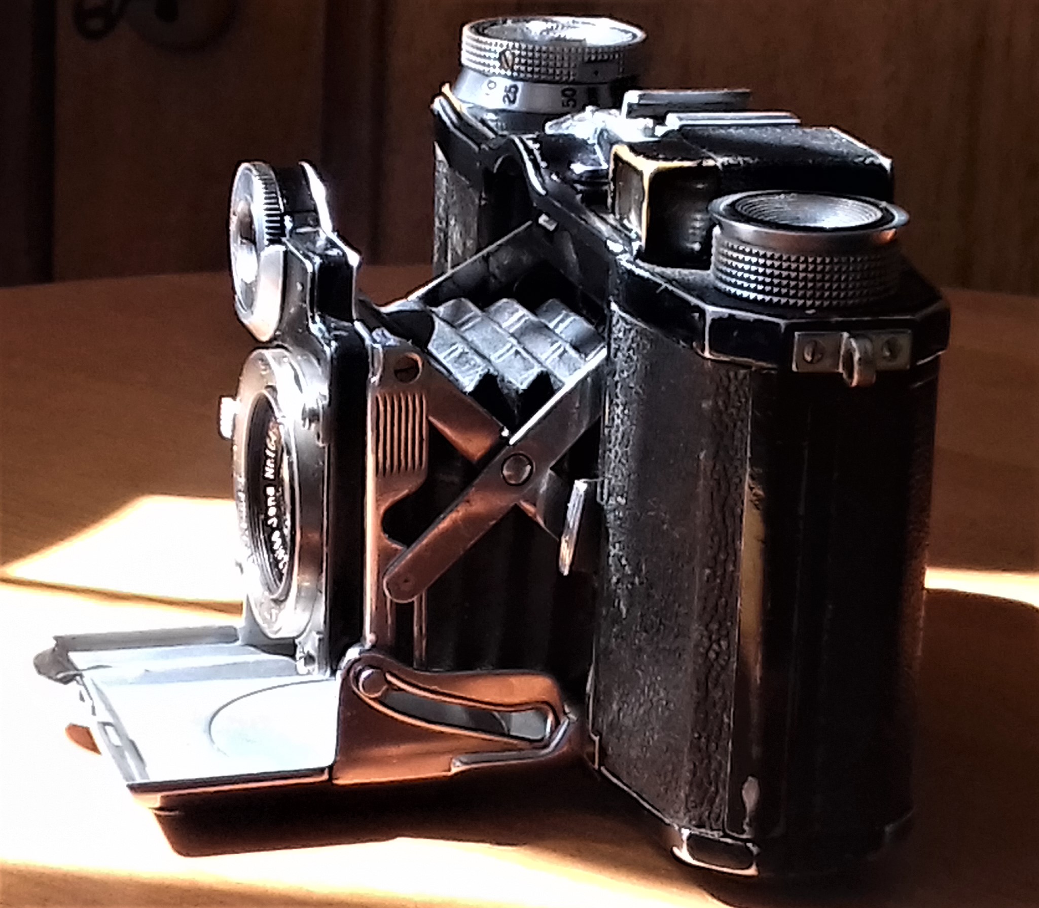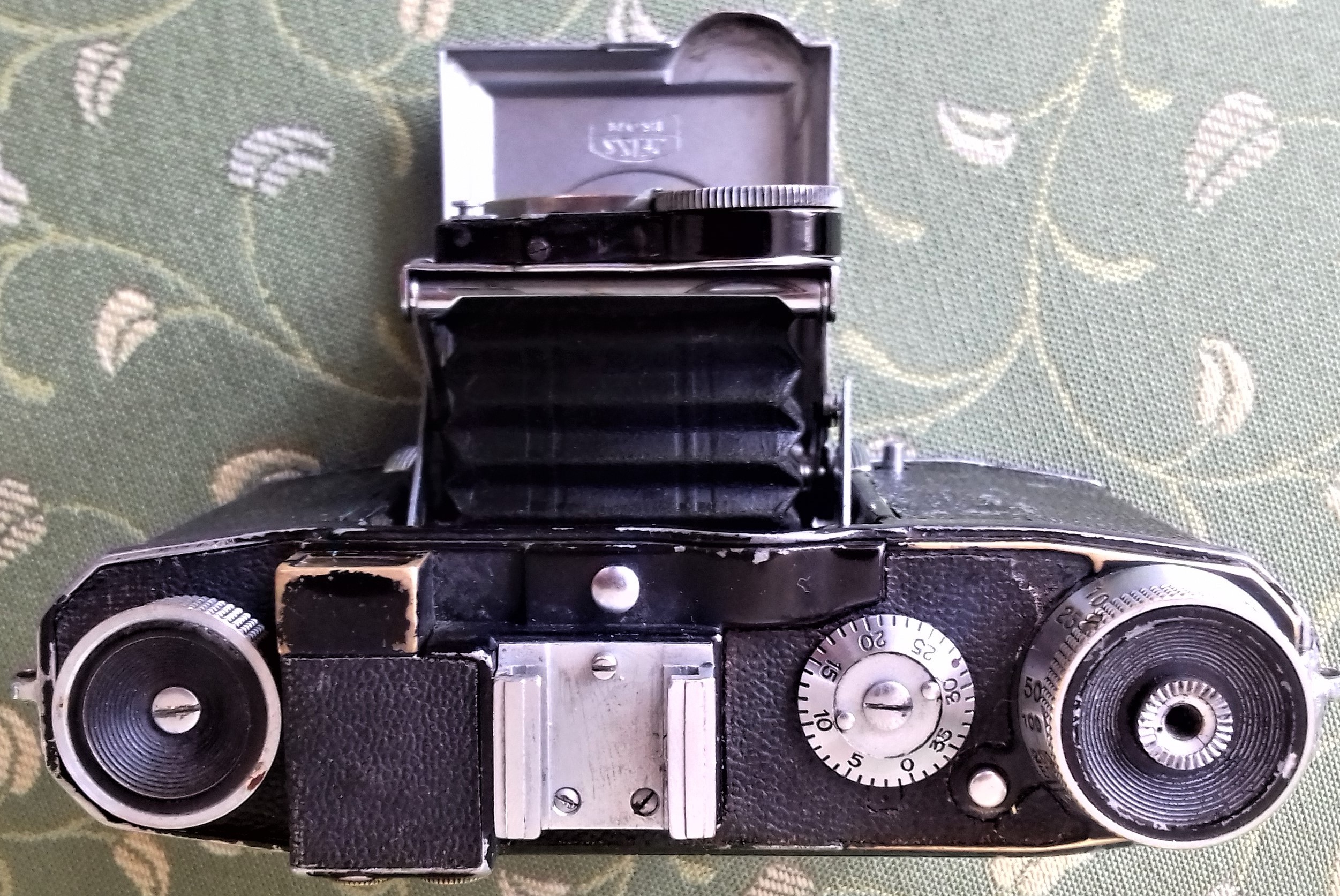 Im Advent des letzten Jahres drückte mir ein Chorbruder, der weiß, dass ich gerne mit alten Kameras fotografiere, nach einer Probe einen relativ schweren, in Packpapier eingewickelten Gegenstand in die Hand. Es gebe ja keine Filme mehr dafür, ich solle mal schauen... Erst einige Stunden später kam ich dazu, mir in Ruhe anzusehen, was ich da bekommen hatte, und traute meinen Augen kaum: Zum Vorschein kam eine äußerlich gut erhaltene Zeiss Ikon „Super Nettel“ von 1939 mit Triotar 1:3,5 und gekuppeltem Entfernungsmesser! Eine Rarität, die in der Regel nur zu ziemlich hohen Preisen zu haben ist. Der Verschluss war leider defekt (wie sich hinterher herausstellte, vor langer Zeit notdürftig mit Tesafilm geflickt), und ich habe ihn als Erstes von einer Fachwerkstatt (gegen stattliches Honorar) reparieren lassen. Der einzige verbliebene Defekt ist jetzt noch ein gebrochener Bügel in der Spreizenkonstruktion zum Ausklappen des Balgens, aber mit etwas Geduld ist es trotzdem möglich, das Objektiv stabil in die korrekte Position zu bugsieren. Die Kleinbildkamera wartet jetzt auf ihren — nach Jahrzehnten — ersten Film.
