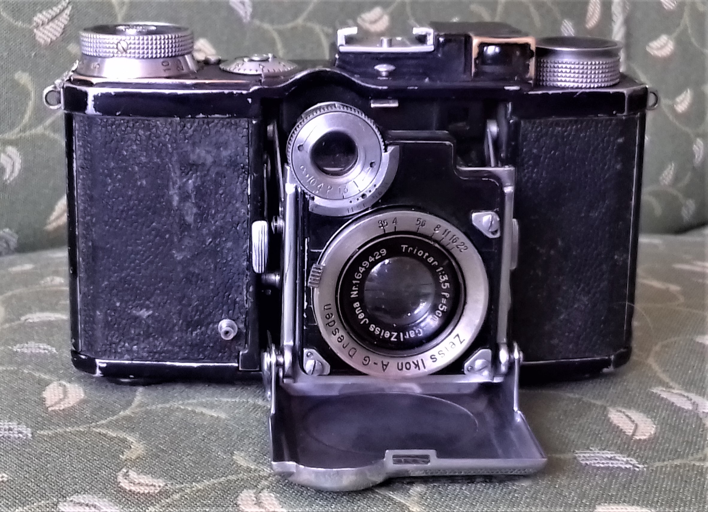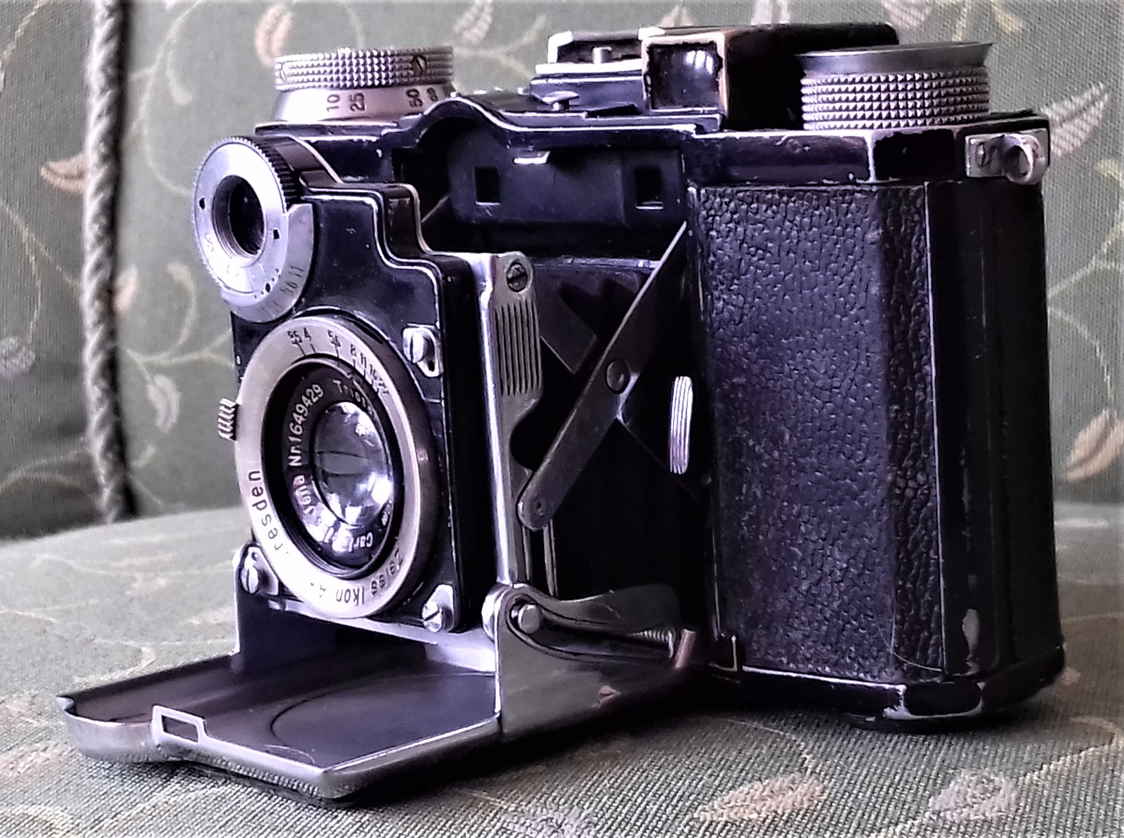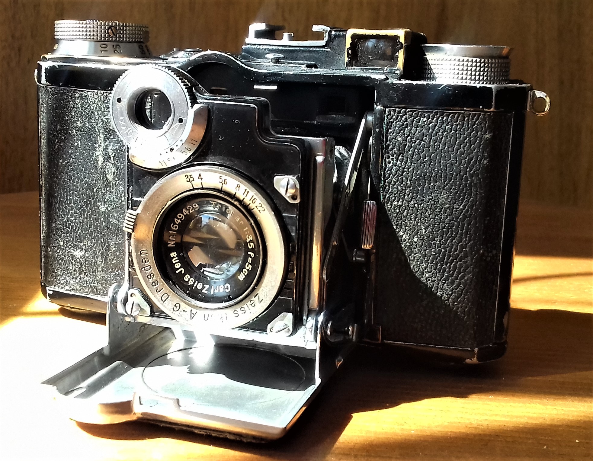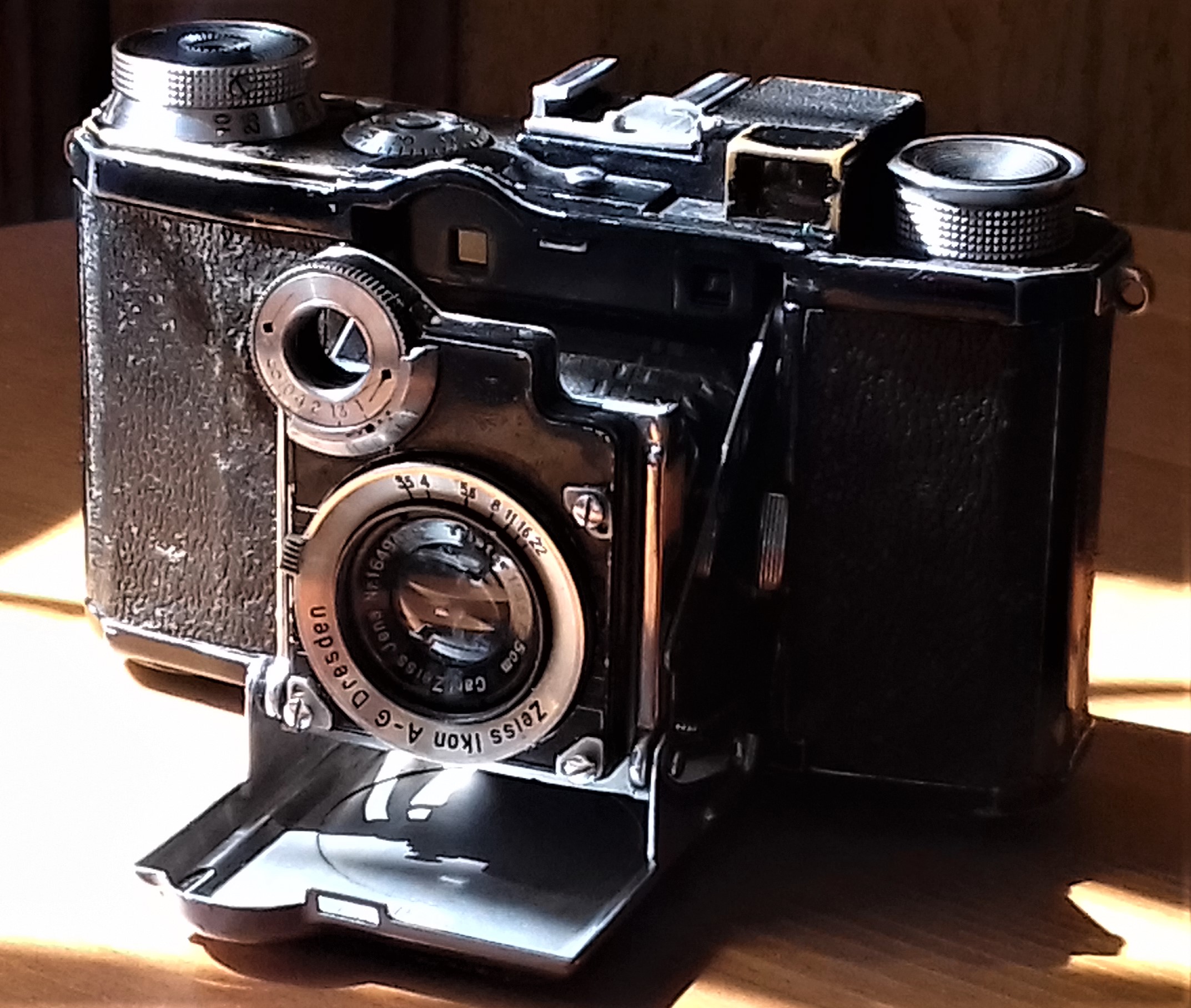 Im Advent des letzten Jahres drückte mir ein Chorbruder, der weiß, dass ich gerne mit alten Kameras fotografiere, nach einer Probe einen relativ schweren, in Packpapier eingewickelten Gegenstand in die Hand. Es gebe ja keine Filme mehr dafür, ich solle mal schauen... Erst einige Stunden später kam ich dazu, mir in Ruhe anzusehen, was ich da bekommen hatte, und traute meinen Augen kaum: Zum Vorschein kam eine äußerlich gut erhaltene Zeiss Ikon „Super Nettel“ von 1939 mit Triotar 1:3,5 und gekuppeltem Entfernungsmesser! Eine Rarität, die in der Regel nur zu ziemlich hohen Preisen zu haben ist. Der Verschluss war leider defekt (wie sich hinterher herausstellte, vor langer Zeit notdürftig mit Tesafilm geflickt), und ich habe ihn als Erstes von einer Fachwerkstatt (gegen stattliches Honorar) reparieren lassen. Der einzige verbliebene Defekt ist jetzt noch ein gebrochener Bügel in der Spreizenkonstruktion zum Ausklappen des Balgens, aber mit etwas Geduld ist es trotzdem möglich, das Objektiv stabil in die korrekte Position zu bugsieren. Die Kleinbildkamera wartet jetzt auf ihren — nach Jahrzehnten — ersten Film.
