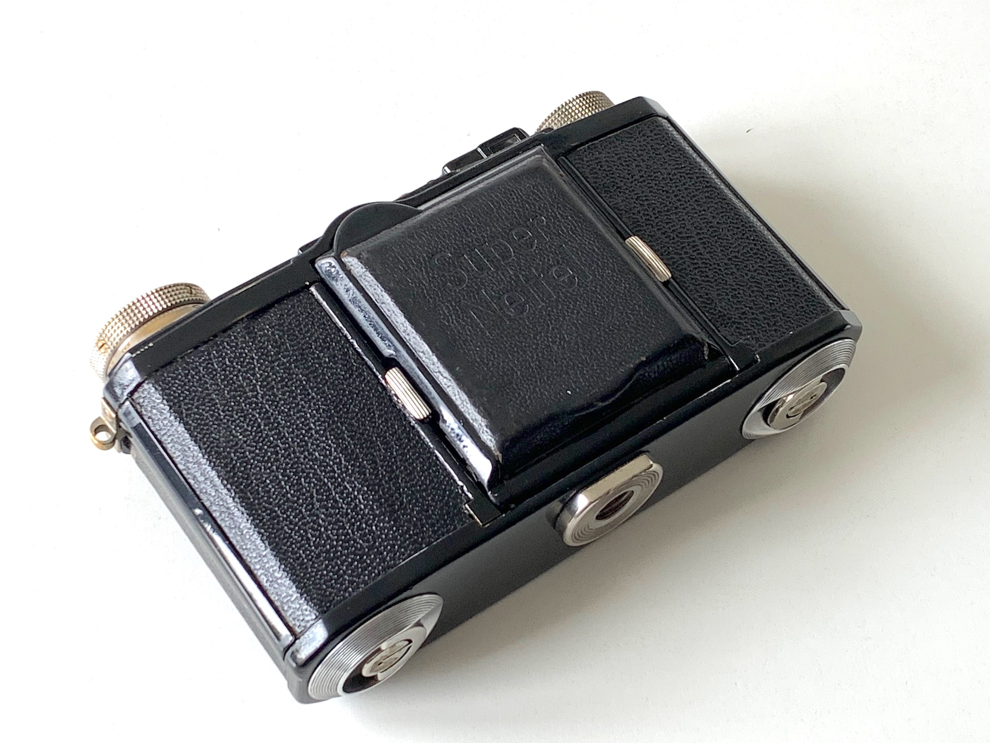 Die beiden Highlights der Kamera sind aber 1. der Metall-Schlitzverschluss (ein vertikal laufender schneller Deckrollo-Verschluss, der Auslöser liegt im Zeitenrad) und 2. der gekuppelte Entfernungsmesser, der wie bei der „Super Ikonta“ mittels eines Drehkeils funktioniert (Einstellrad 1m bis ∞ links über dem Objektiv). Es gibt für ihn einen separaten, gelb getönten Sucher direkt neben dem eigentlichen Sucher für den Bildausschnitt. Mittels eines „Contameter“-Sets mit drei Linsenvorsätzen ließ sich der Ausschnitt noch präziser eingrenzen.