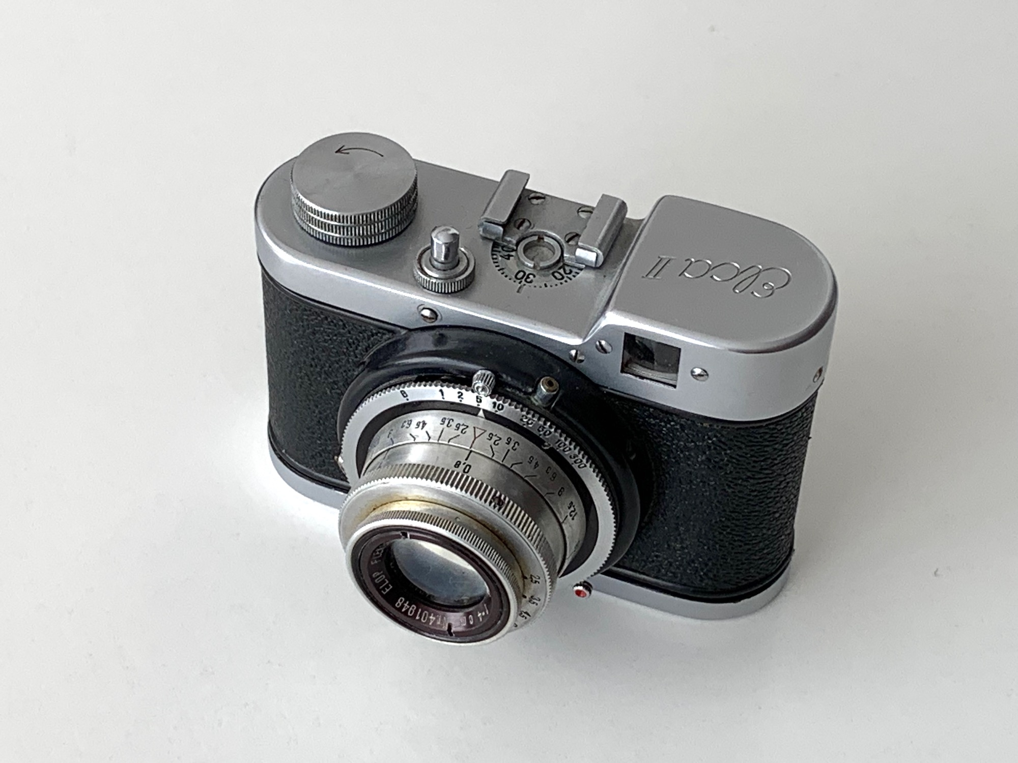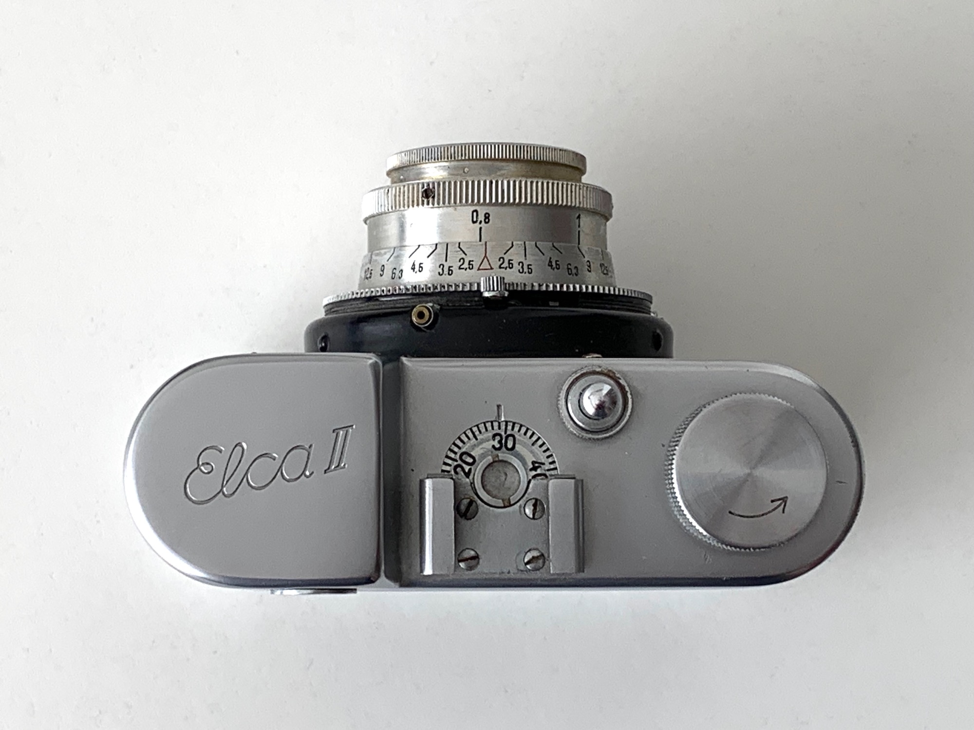 hier ist noch die frühere Version der oben gezeigten Kamera, die Elca II. Unter dieser Bezeichnung wurde das Modell im Zeitraum 1949–50 angeboten, als die Herstellerfirma noch Elop (Elektro-Optik) hieß. Es gab auch ein einfacheres Vorgängermodell Elca, das ich allerdings nur aus der Literatur kenne.