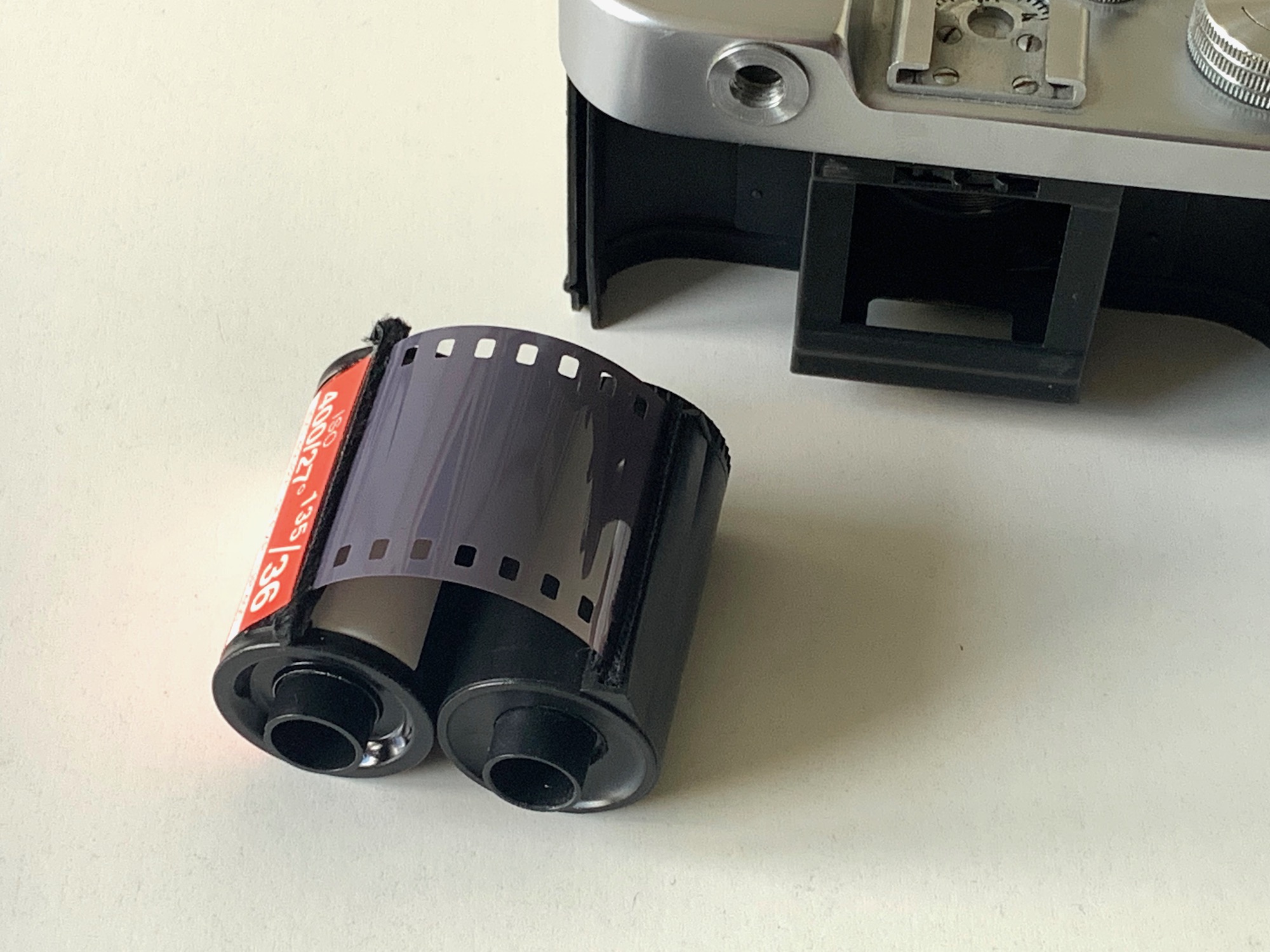 So wird es wohl gewesen sein. Ich vermute, dass solche wiederbefüllbaren Patronen leicht erhältlich waren. Jeder, der Meterware benutzte, brauchte so etwas. – Übrigens hat das Prinzip noch einen weiteren Vorteil: Man muss keine 50 Aufnahmen machen, sondern kann den Film jederzeit ohne größeren Bildverlust entnehmen, wie ich es oben illustriert habe, durchschneiden und in eine neue leere Patrone einlegen. Damit war man relativ flexibel, was die Anzahl der Aufnahmen betrifft.