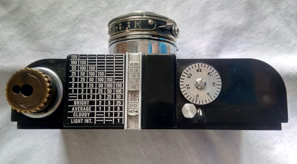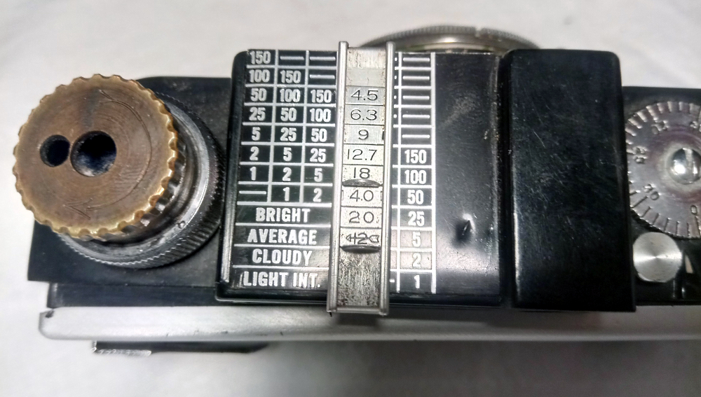 Der Belichtungsmesser funktioniert folgendermaßen. In dem rechteckigem Schacht zwischen Sucher und dem Drechknopf für den Filmtransport sind sechs Fensterchen mit abgestufter Lichtdurchlässigkeit. Der Schlitten auf der Belichtungstabelle wir dann bis zu dem Fenster verschoben durch dass gerade noch Licht durchscheint.