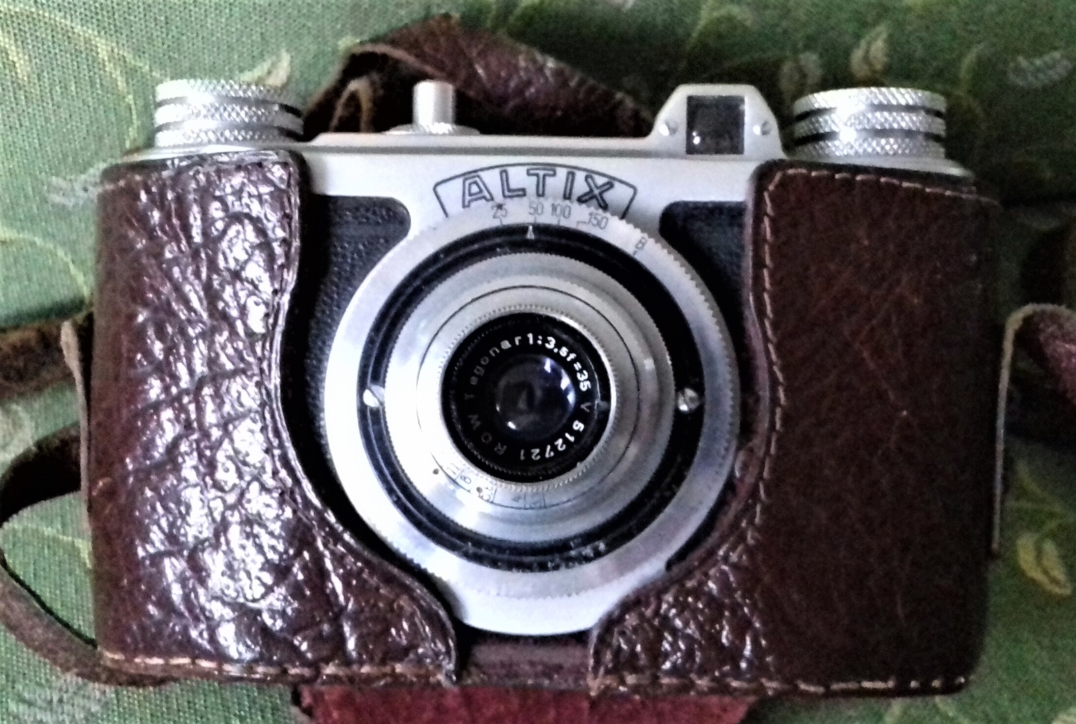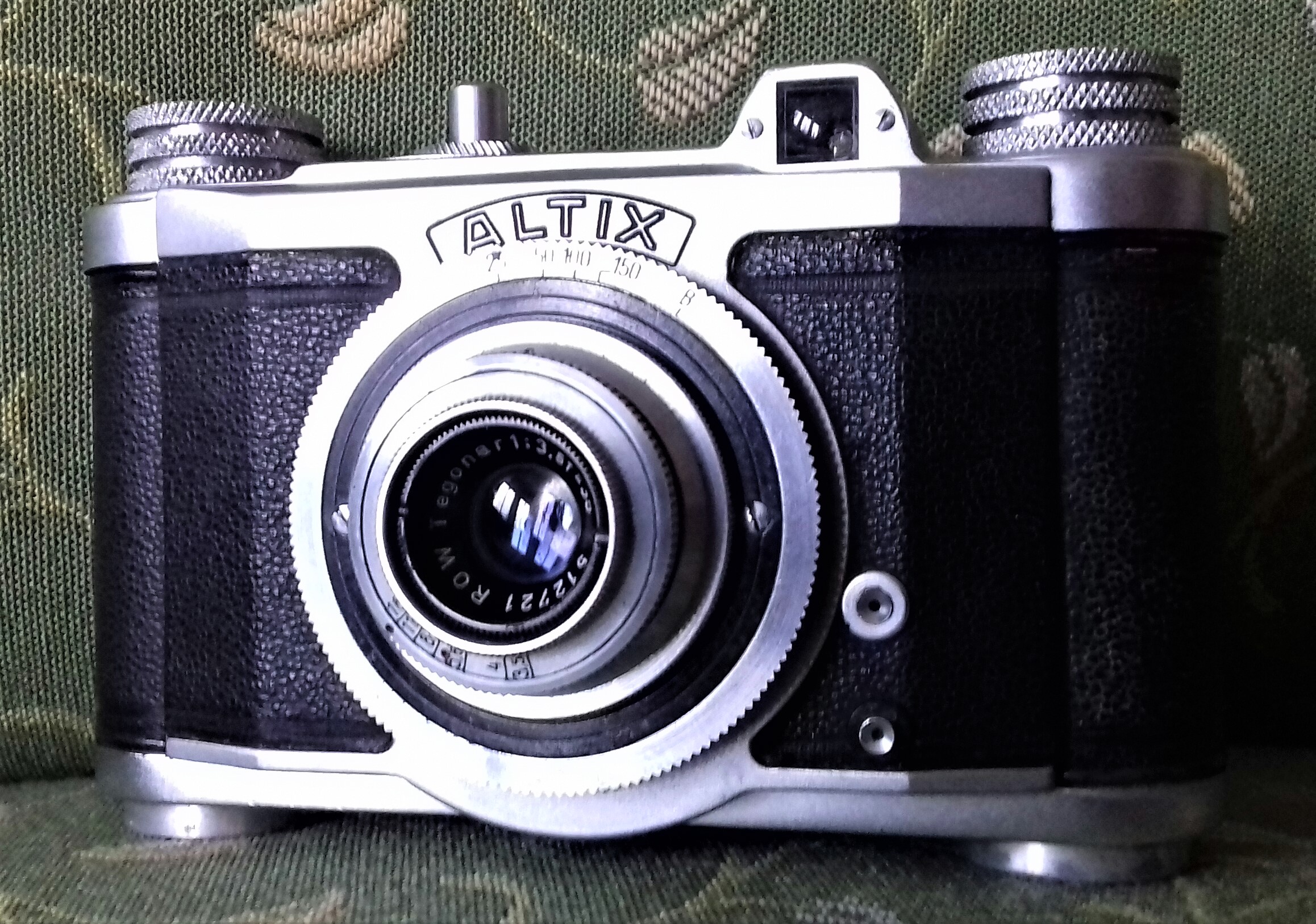 heute möchte ich eine sehr schöne kompakte und wertige Nachkriegs-Kleinbildkamera der Altissa Kamerawerke in Dresden vorstellen, und zwar die Altix III mit ROW Tegonar 3,5/35 (Wechselobjektiv, M22,5-Gewinde) für das Bildformat 24 x 24 mm, gefertigt von 1949 bis 1953. Sie hat eine Blitzsynchronisation (2 Blitzbuchsen; obere Buchse Masse, untere Signal), Zeiten von 1/25 bis 1/150 (+ B), Blenden von 3,5 bis 16 und Entfernungen von 0,75 m bis unendlich, außerdem einen hellen Durchsichtsucher, eine Tiefenschärfetabelle auf dem Rückendeckel, zwei Stativgewinde (3/8, 1/4) und ein Filmzählwerk auf der Oberseite neben dem Auslöser. Man öffnet die Kamera am Boden, beim Einfädeln des Films hilft der hochklappbare Rückwanddeckel.
