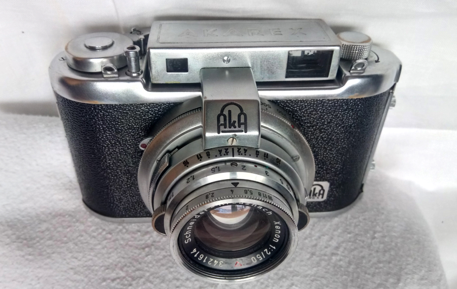 die Akarex III wurde in der ersten Hälfte der 1950ger Jahre von der Firma AkA Apparate und Kamerabau Gmbh, Friedrichshafen auf den Markt gebracht. Sie hat einen gekuppelten Entfernungsmesser, der mit dem Objektiv über eine Brücke verbunden ist. Bei Objektivwechsel (Weitwinkel und Tele) ist somit immer der richtige Sucher verfügbar. Dieses frühe Modell mit dem Xenon 2,0/50 mm kostete damals 366 DM.