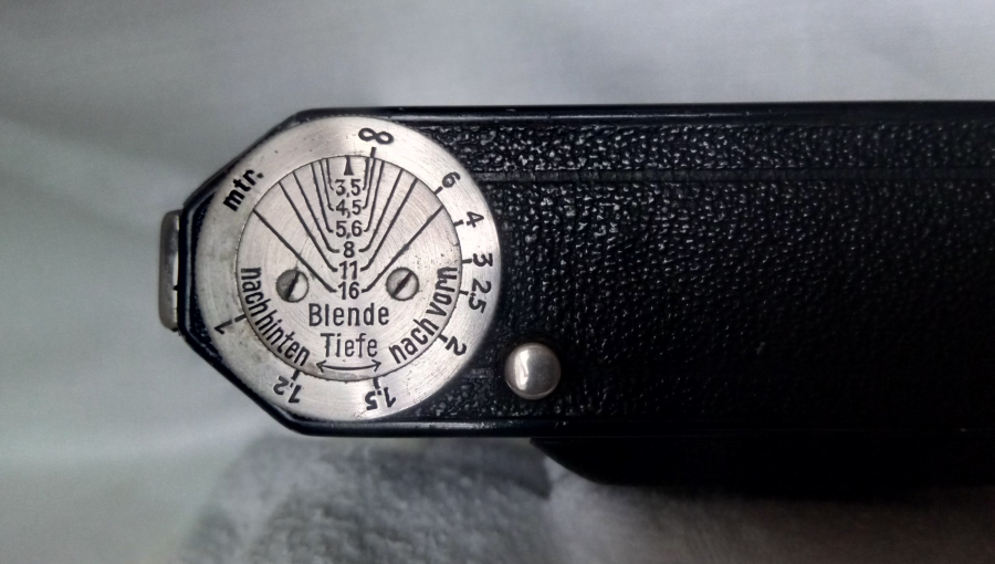 Auf der Unterseite eine Drehscheibe mit Markierung für den Schärfenberreich.
