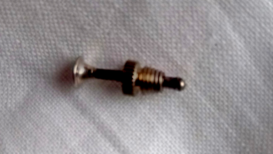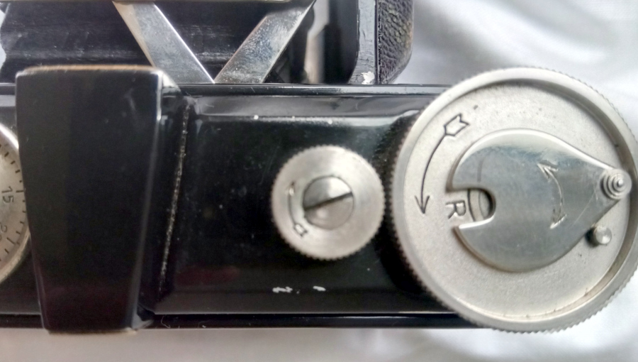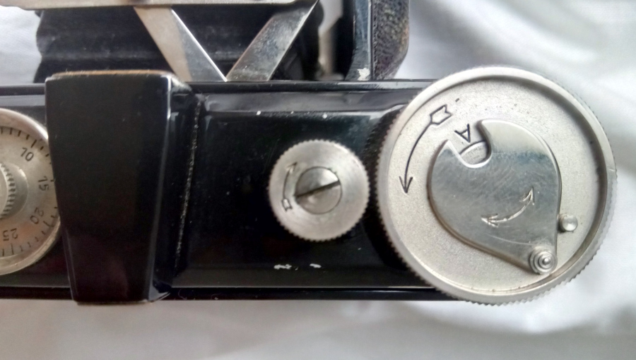 Der kleine Drehknopf dient zum Entsperren des Filmtransportknopfes. Er wird um eine viertel Umdrehung gedreht, dann kann der Film weiter transportiert werden. Gleichzeitig mit der viertel Drehung springt der Bildzähler weiter.