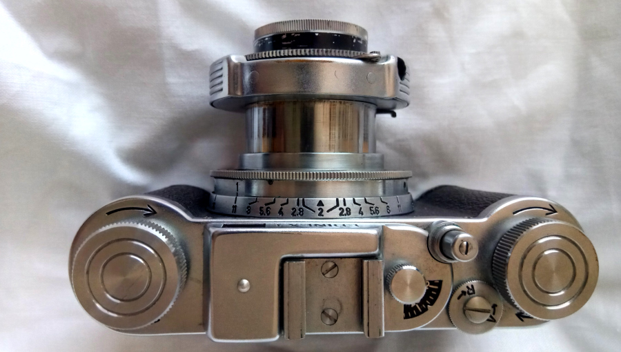 Bildzählwerk, Zubehörschuh und Aussengewinde am Auslöseknopf.