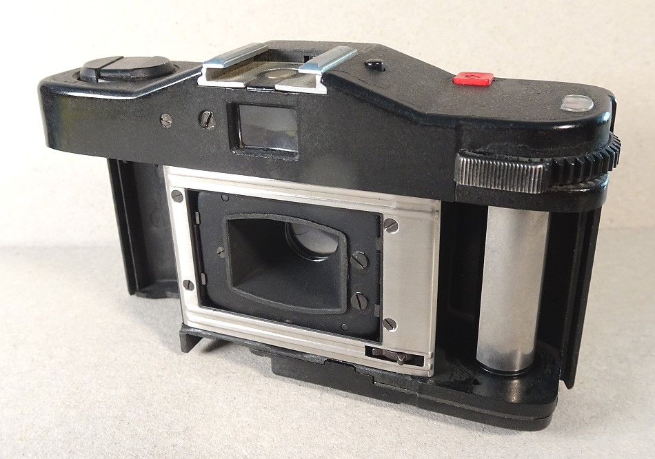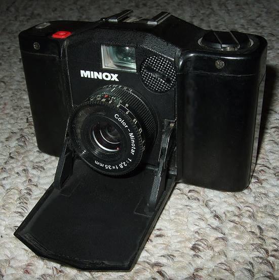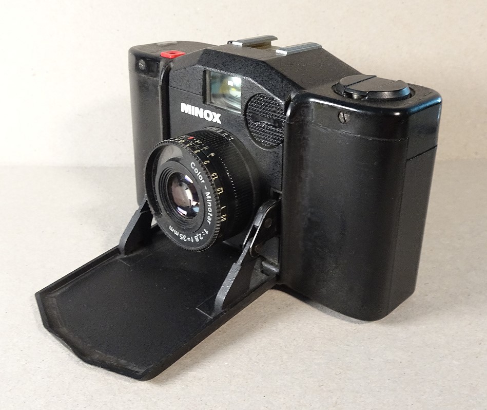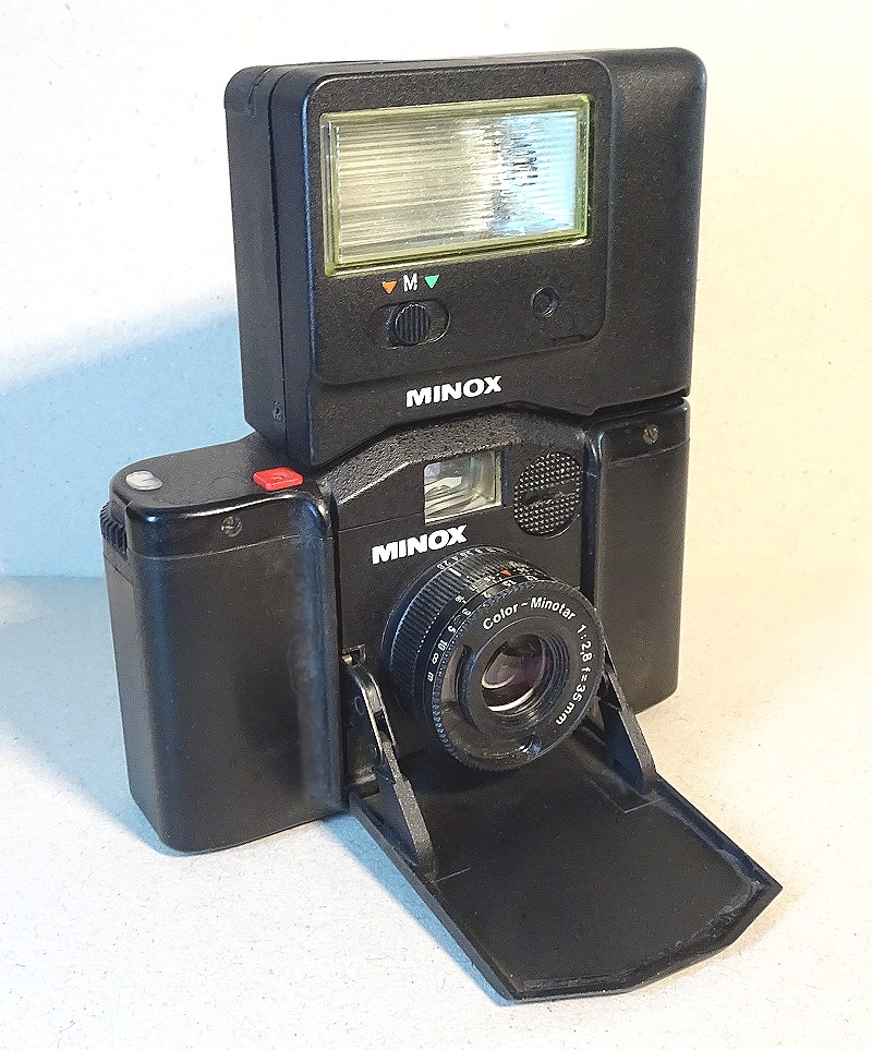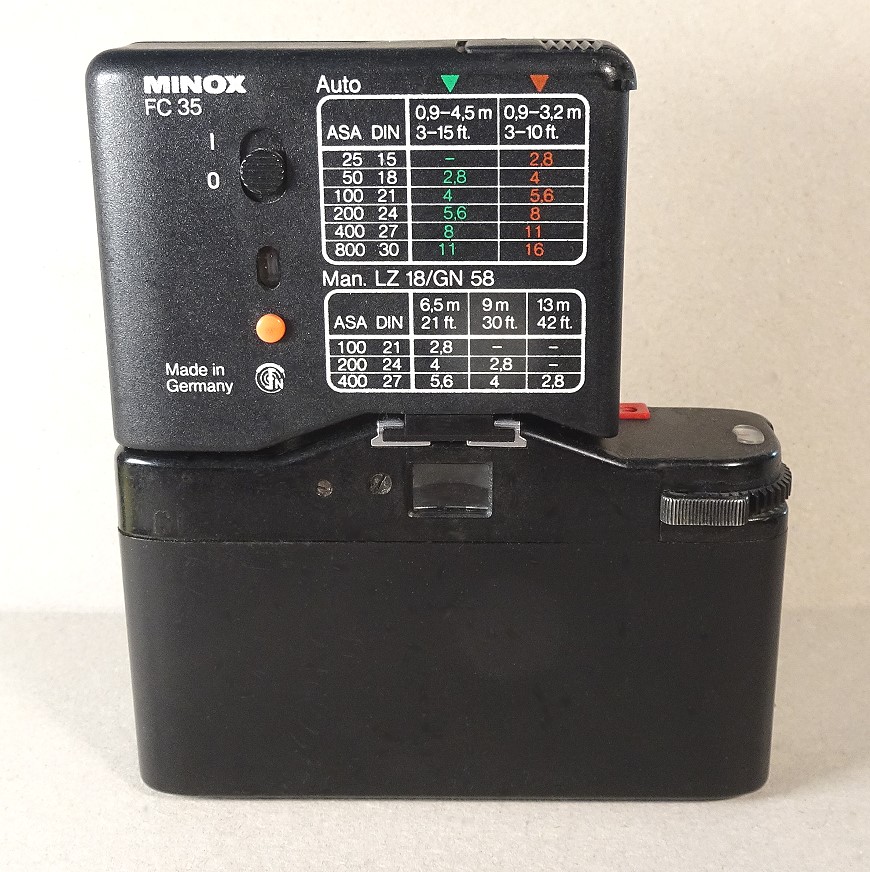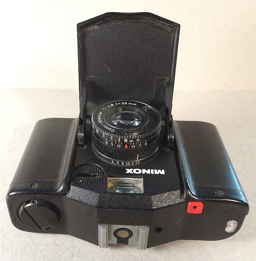 Das hier gezeigte frühe Modell der Minox 35EL hatte noch einen schwarzen Krissel-Anstrich, der sich über die Jahre (wie bei nicht wenigen dieser Modelle ) vom Plastik- (Plaste-) Material teilweise gelöst hat. Spätere Modelle wurden aus Makrolon gefertigt und das Problem war weg.