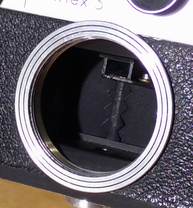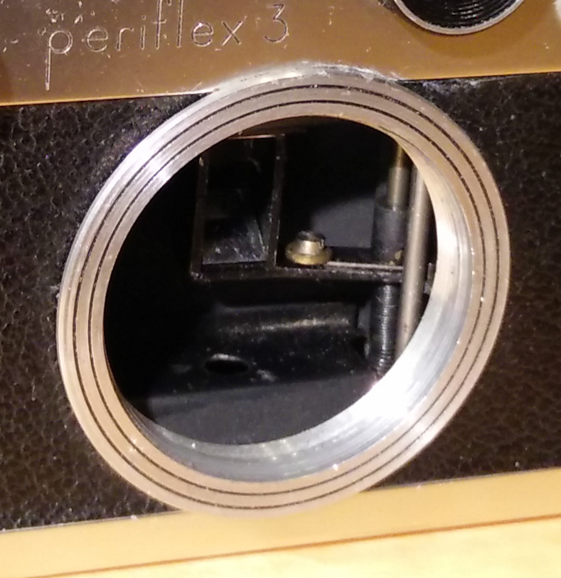 Für die Periflex I gab es einen "Eye Level Finder", der bei Nichtverwendung am Rückspulknopf angebracht werden konnte. Das Bild ist rel. dunkel und nicht nur seitenverkehrt, sondern (wie nicht anders zu erwarten) auch noch "upside down".