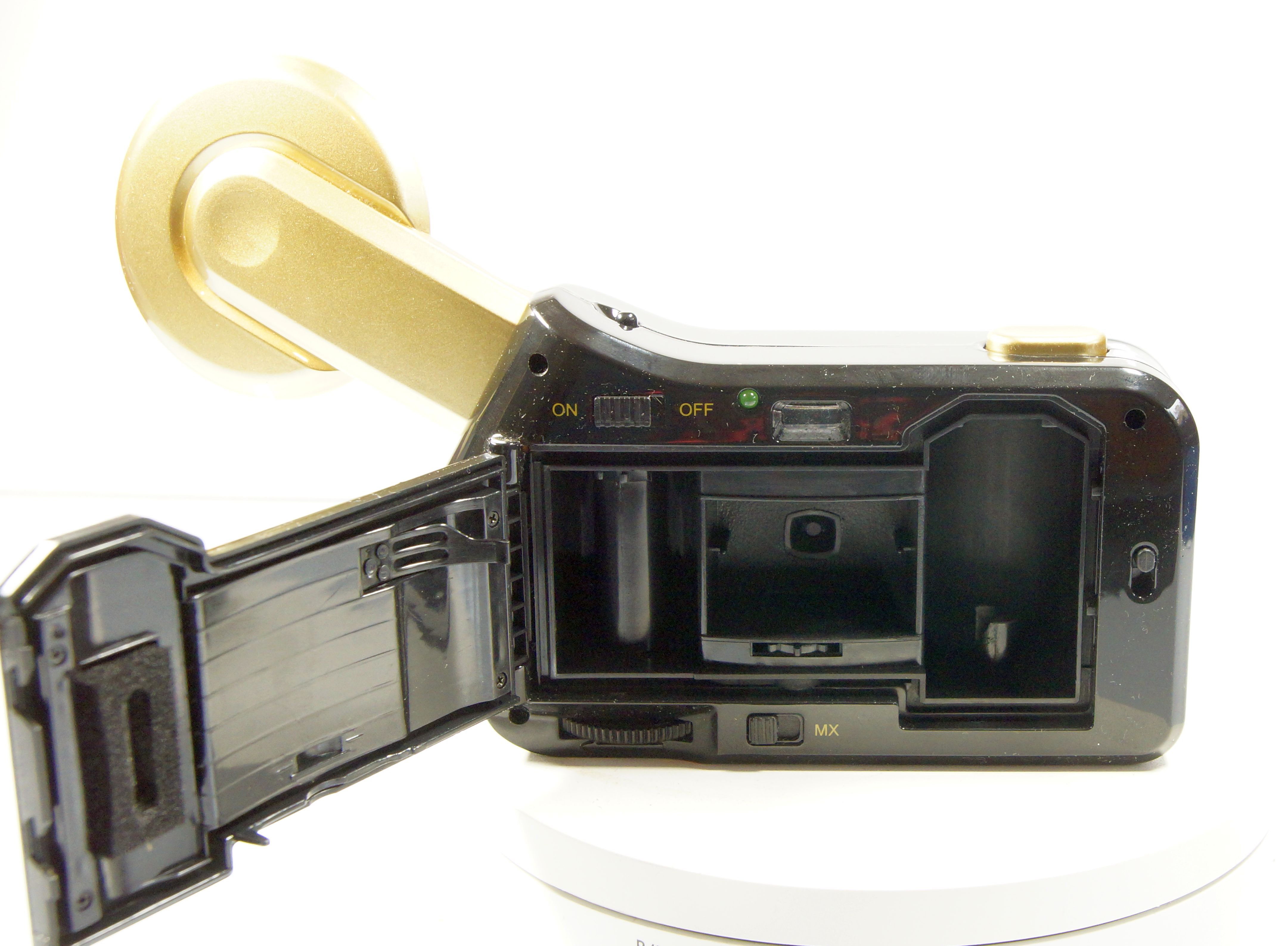 Die Doppelbelichtungsfunktion wird mit dem MX Schalter auf der Rückseite Verwendet. Der Schiebeschalter auf der Unterseite steuert den Verschluss, L Auslösesperre/N, normal 1/125 und B für Bulb.