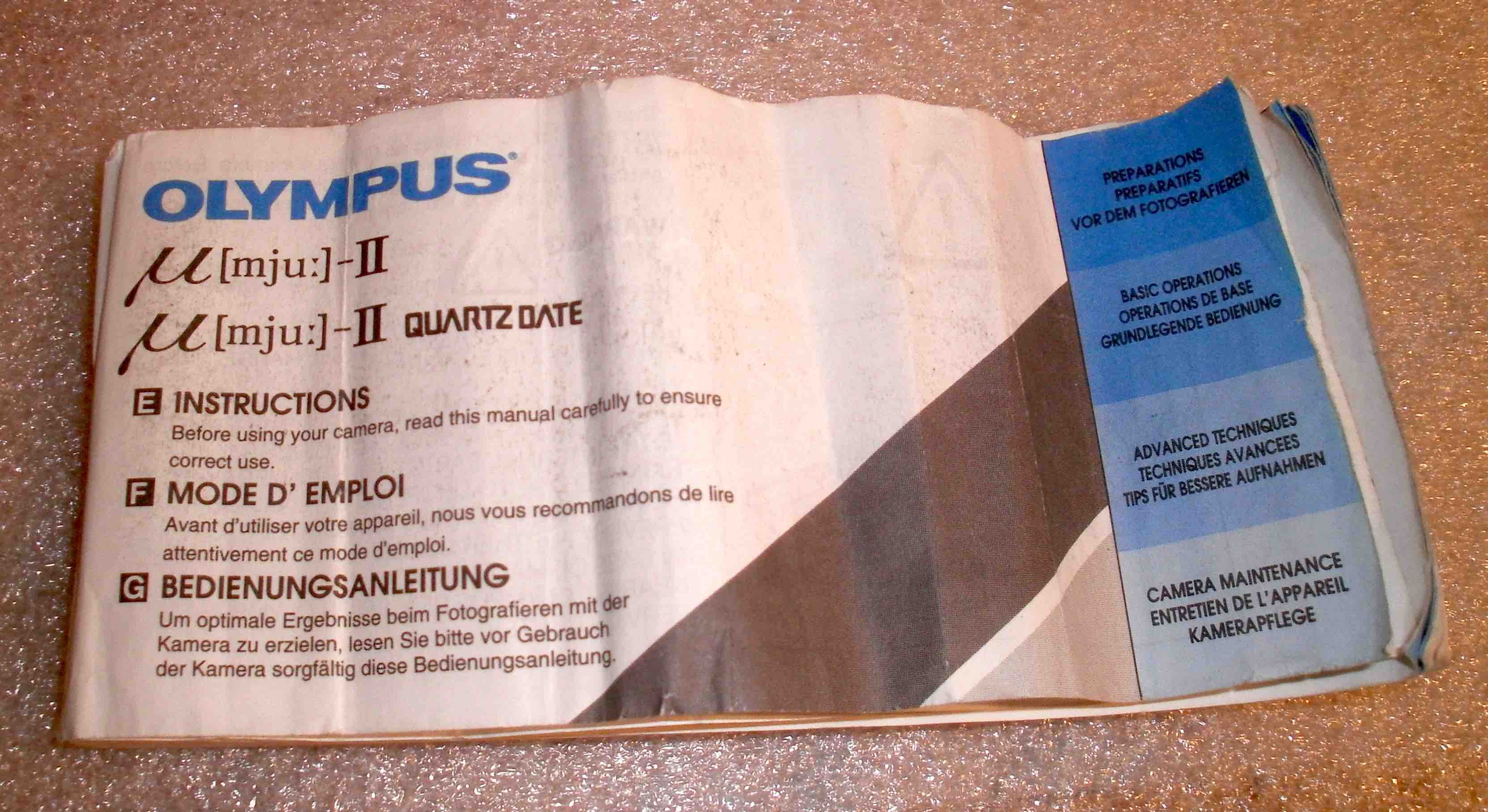 Hallo ! Ich habe gestern 3 Kameras gekauft für 3,-€ und zwei davon waren von Olympus.Die Modelle sind MJU-1 und MJU-2,beide mag ich sehr und hatte schon welche aber noch keine MJU-2 in Champagnerfarben.Da in beiden noch Filme sind mache ich keine Fotos von innen.In der Schutztasche der MJU-2 war auch noch die originale Anleitung ....ist aber etwas zerknittert und wird gerade gepresst.