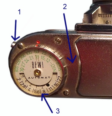 • Belichtungsmesser: Bewi-Automat. Eingebauter Selenmesser mit Extraknopf und automatischer Rechnungstabelle und Empfindlichkeitskorrektur. Besonderheit - siehe oben das Vorwort.