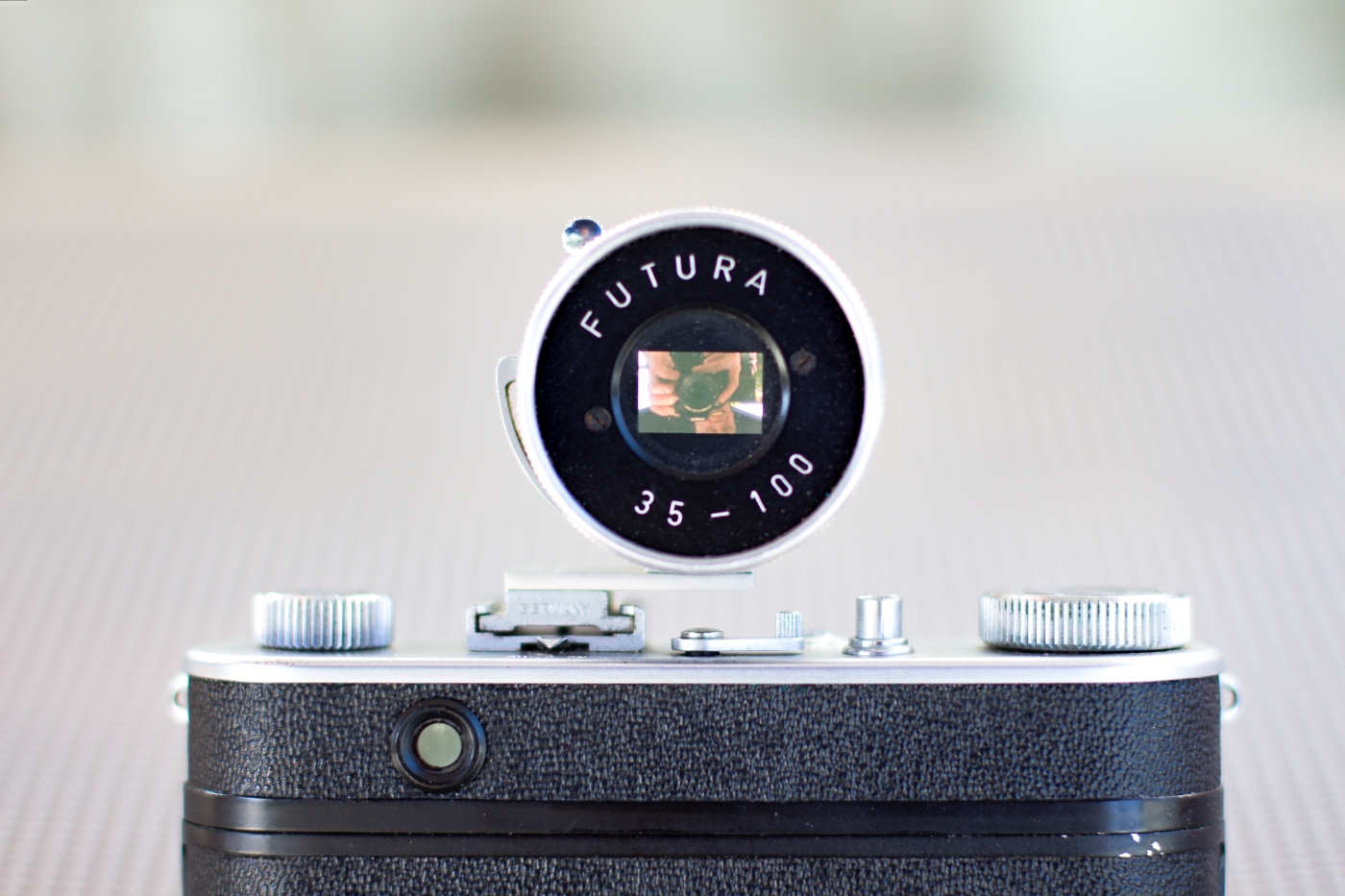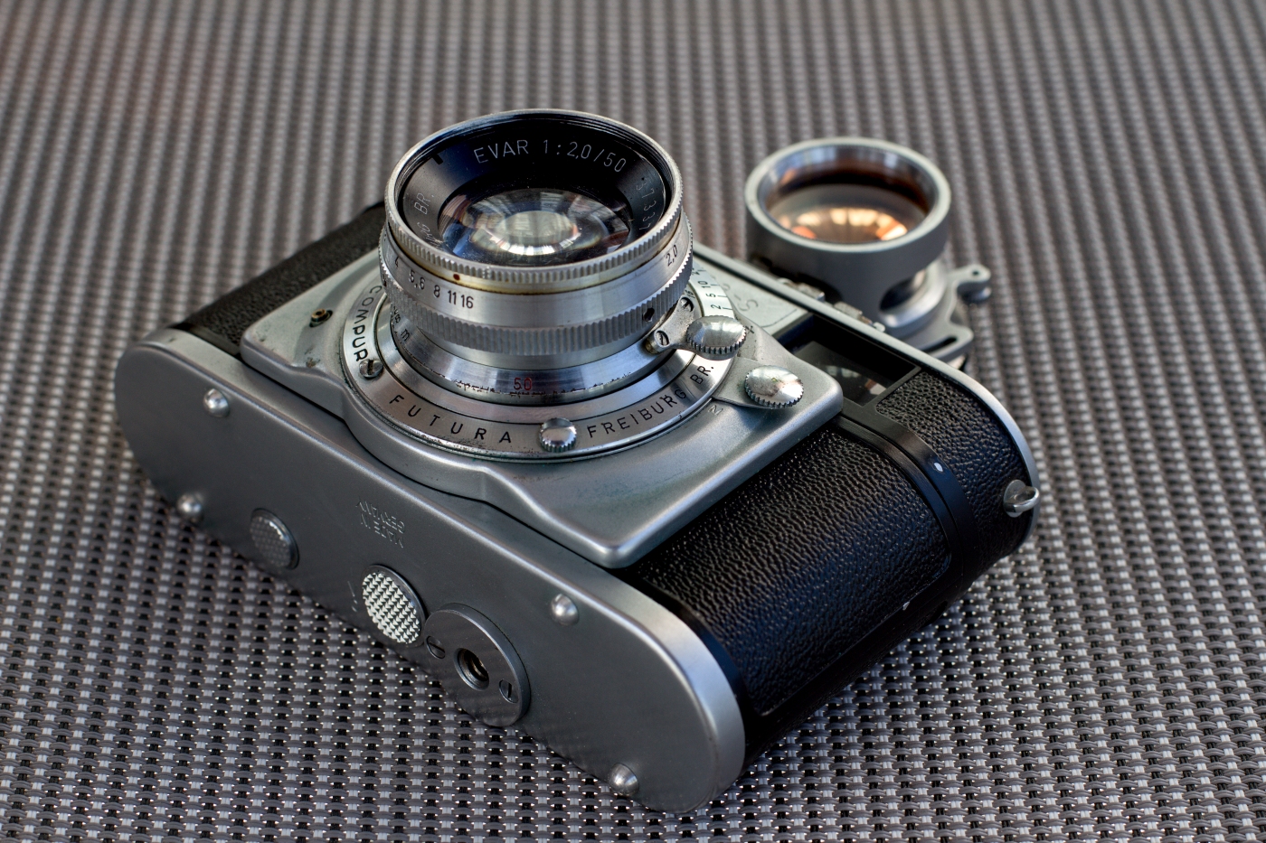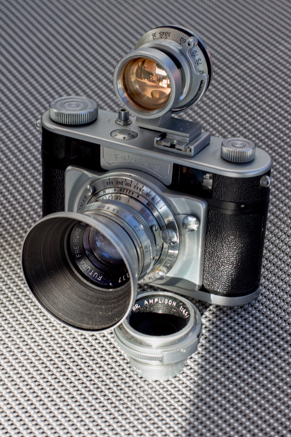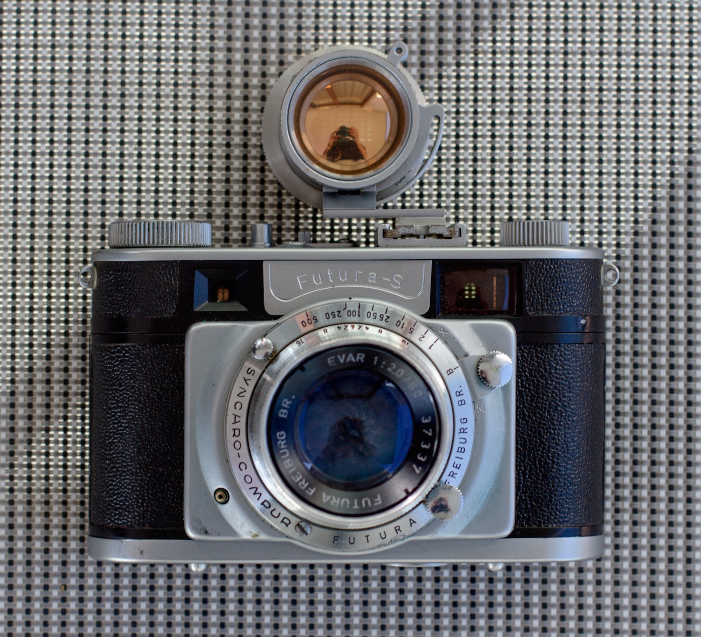 Futura Kameras wurden von Fritz Kuhnert, Freiburg i.Br., von 1946 - 1957 produziert. Die Futura-S (S = Synychronverschluss) kam 1952 (andere Quellen sagen 1953 und 1955) auf den Markt und ist eine für damalige Zeit hochwertige Rangefinder Kamera mit gekoppeltem Entfernungsmesser und aufsteckbarem Universalsucher 35-100mm, der für Nahaufnahmen nach unten schwenkbar ist. Die Objektive waren natürlich wechselbar. Das Normalobjektiv ist hier das EVAR 1:2/50mm. Als Weitwinkel galt das AMPLIGON 1:4,5/35mm. Weitere Objektive reichten von 45mm bis 90mm. Die Futura wurde angeblich nur 9000 Mal hergestellt. Es gibt wenig verläßliche Quellen. Ich versuche grade mit einem Freiburger Sammler der Futura Kontakt zu bekommen, um mehr zu erfahren.