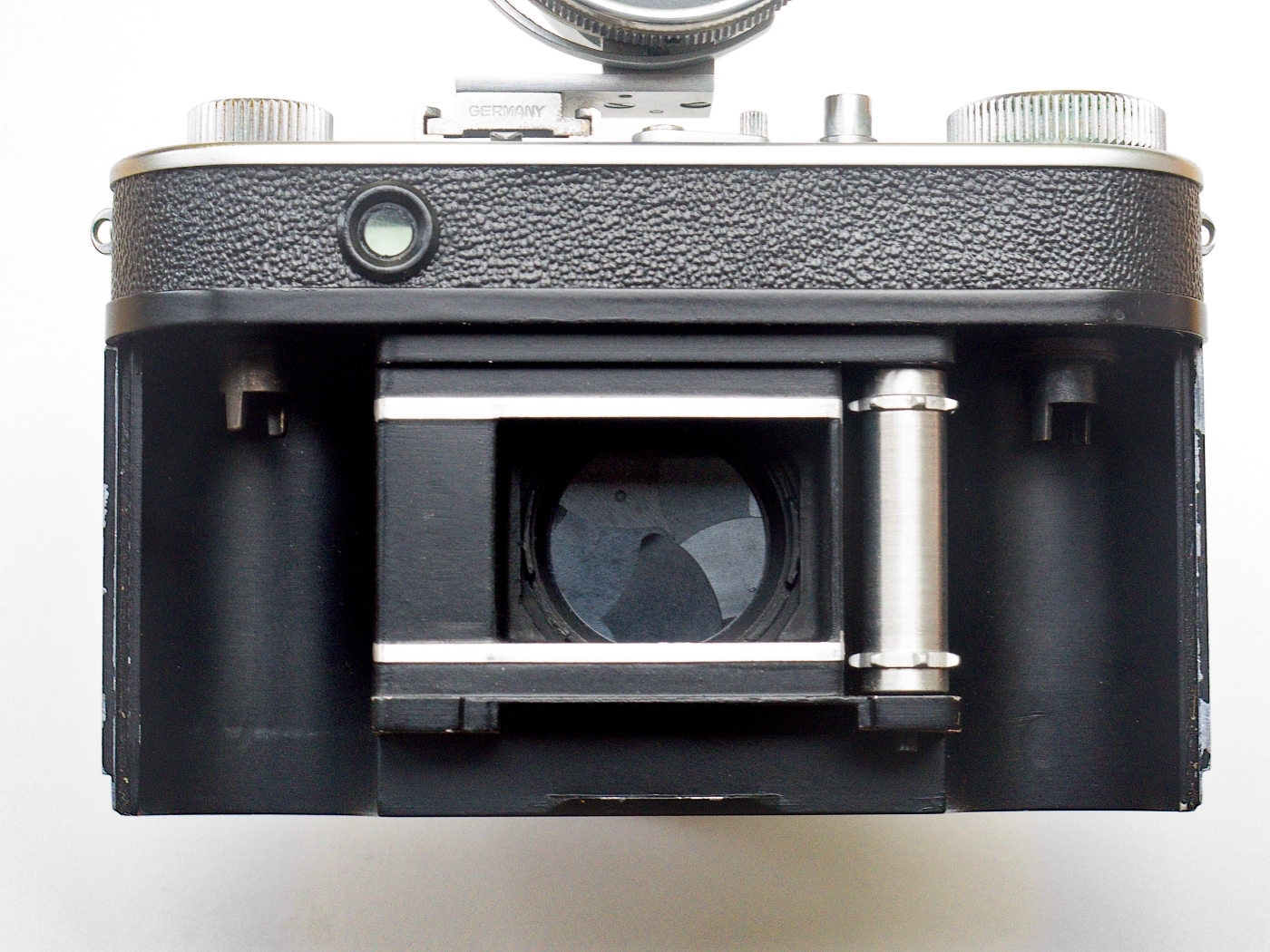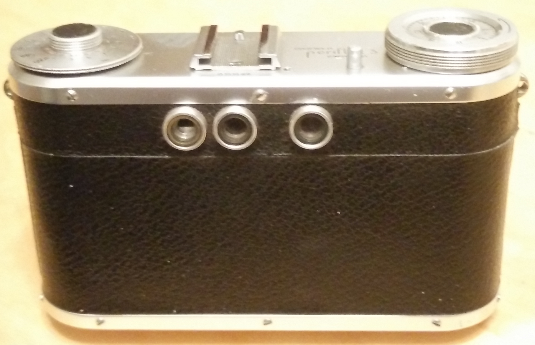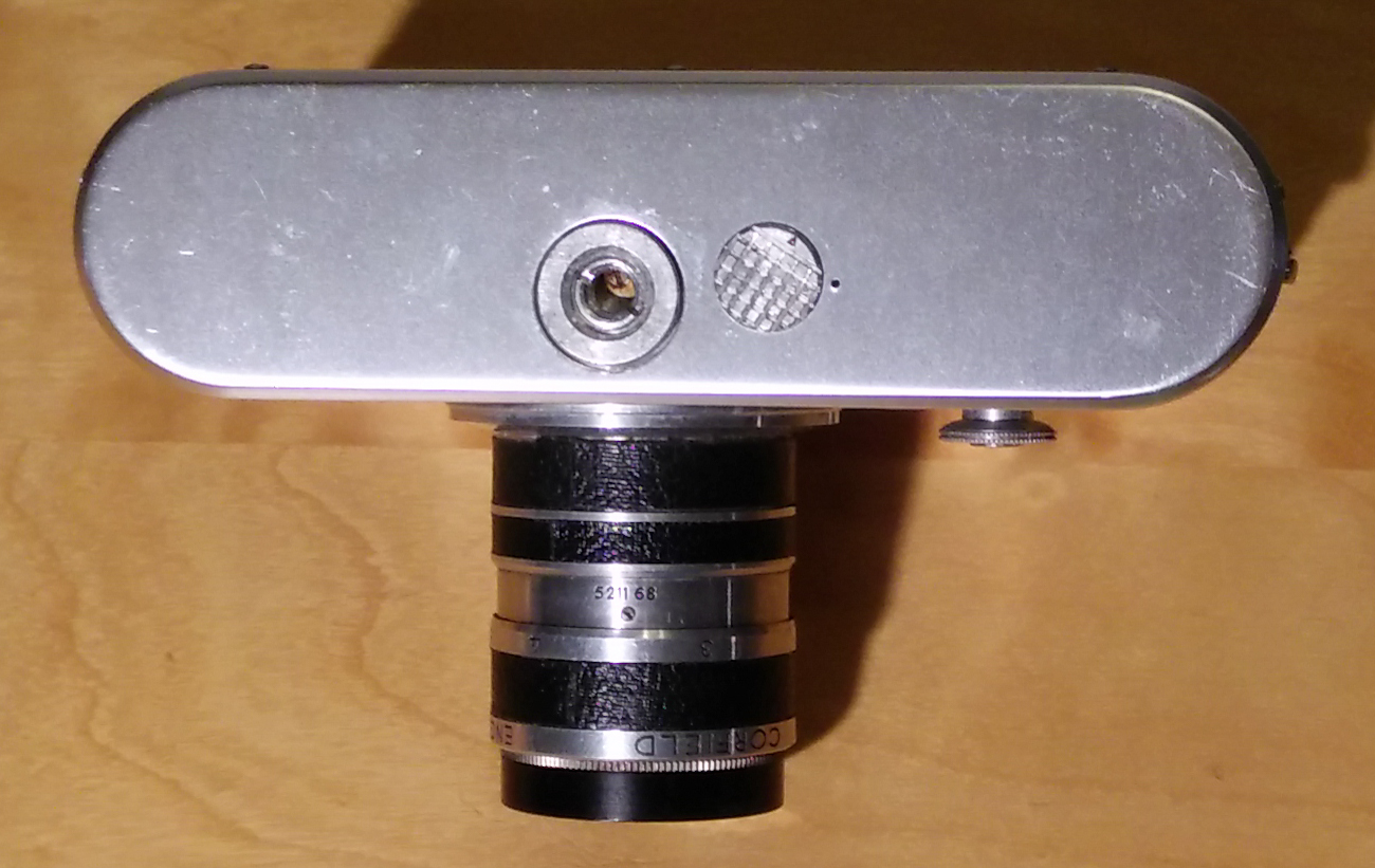 LTM-Gewinde, aber höchstwahrscheinlich ist das Auflagemaß zu hoch, um an einer Leica verwendet werden zu können. Bei der englischen Corfield war das möglich. Aber das war nicht der einzige Grund, wieso ich jetzt diese ins Spiel brachte: Wenn man sich beide Cameras von unten ansieht, fallen gewisse Gemeinsamkeiten auf: das etwas dickere Gehäuse und die geriefelten, etwas billig wirkenden Verriegelungsknöpfe mit Karo-Muster. War ungefähr dieselbe Zeit. Wer sich da von wem inspirieren ließ, ist unschwer zu erraten.