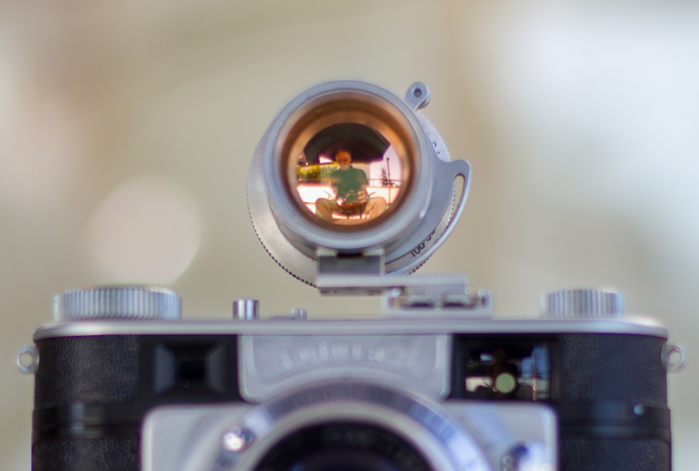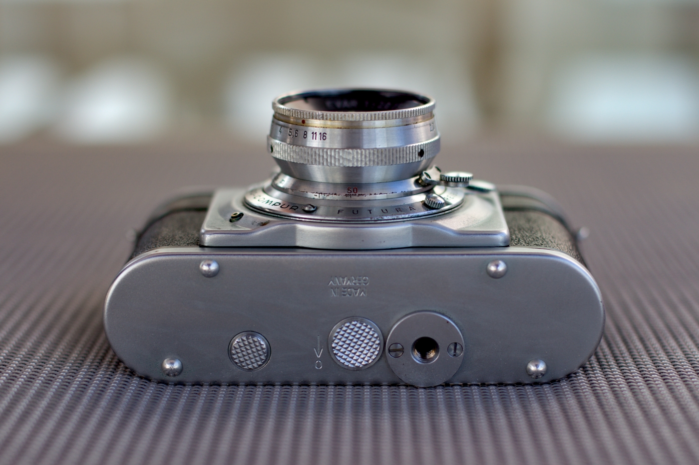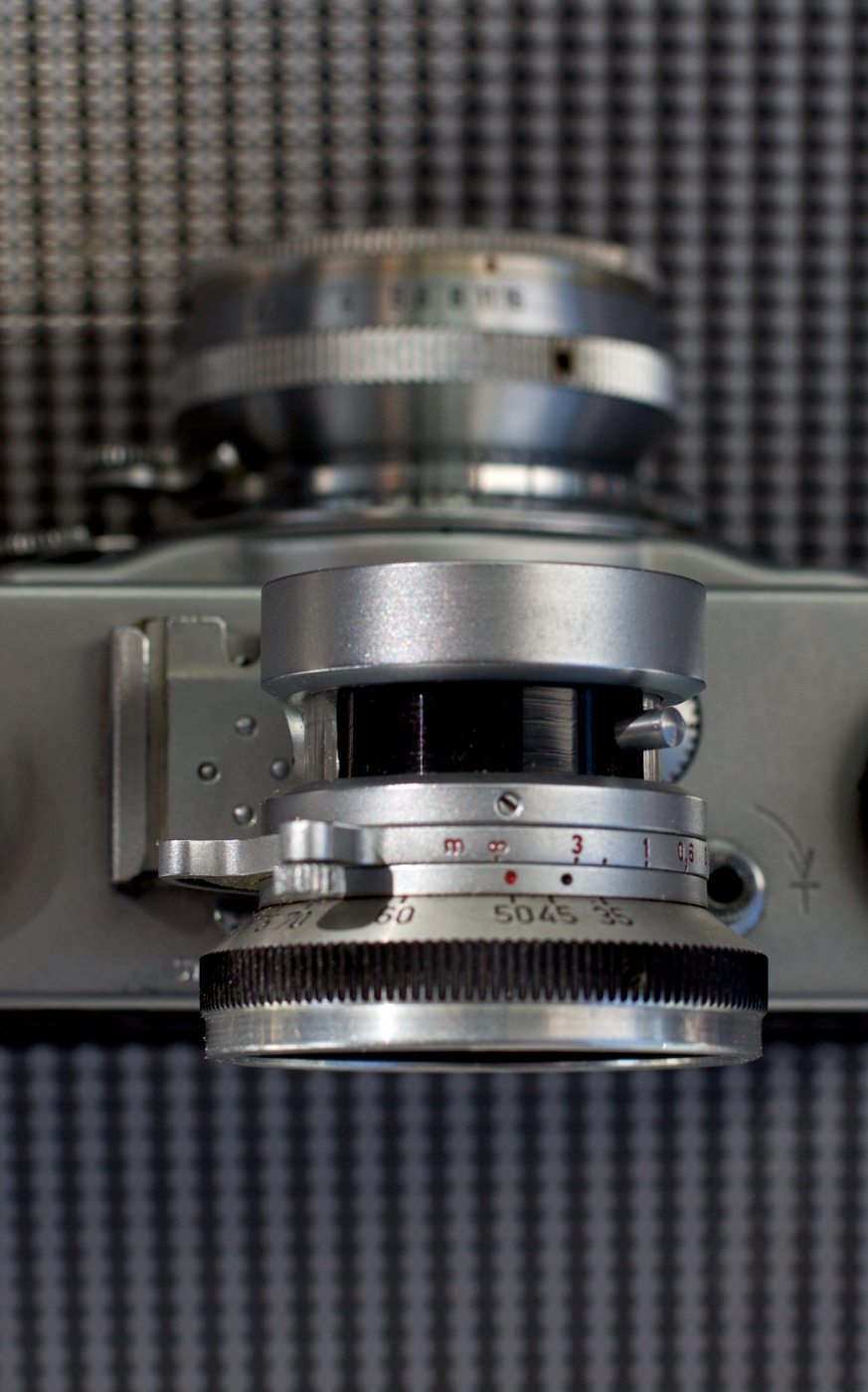 LTM-Gewinde, aber höchstwahrscheinlich ist das Auflagemaß zu hoch, um an einer Leica verwendet werden zu können. Bei der englischen Corfield war das möglich. Aber das war nicht der einzige Grund, wieso ich jetzt diese ins Spiel brachte: Wenn man sich beide Cameras von unten ansieht, fallen gewisse Gemeinsamkeiten auf: das etwas dickere Gehäuse und die geriefelten, etwas billig wirkenden Verriegelungsknöpfe mit Karo-Muster. War ungefähr dieselbe Zeit. Wer sich da von wem inspirieren ließ, ist unschwer zu erraten.