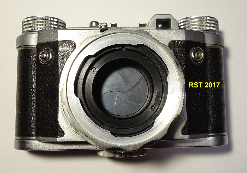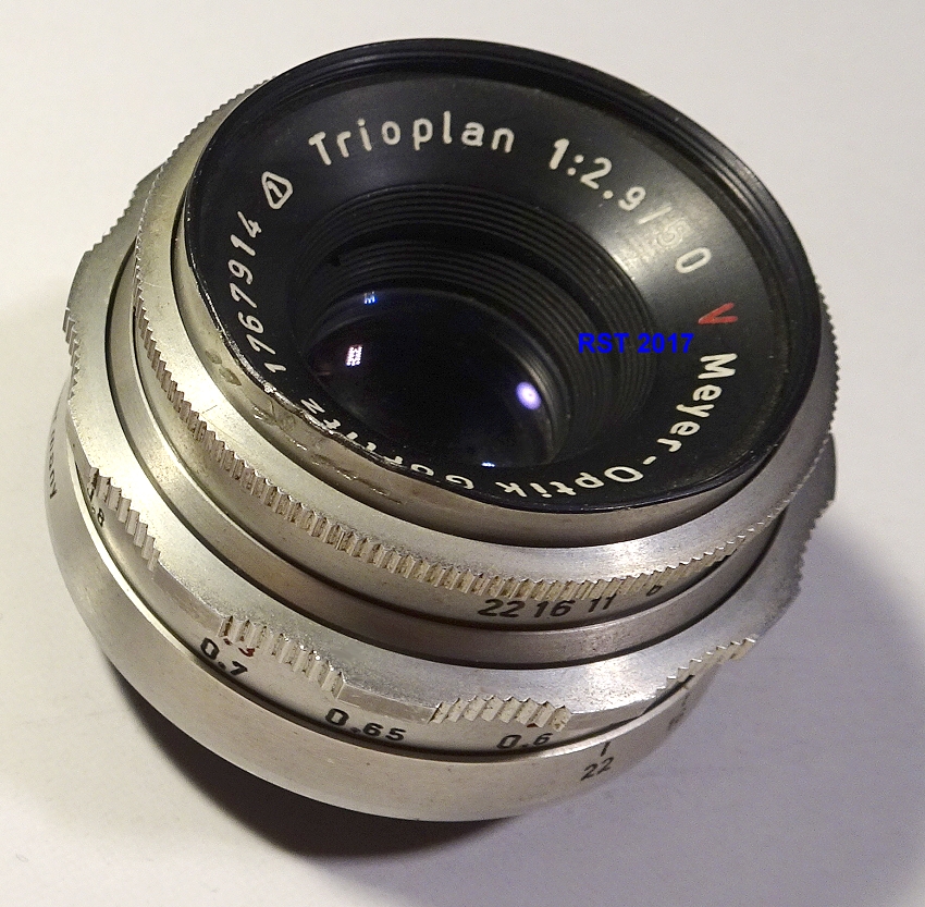 Objektiv: Wechselobjektiv mit Bajonettverschluss. Meyer Trioplan 1:2,9 f=5 cm. 0,6 Meter bis unendlich. Schärfentiefe-Tabelle. Modell mit anderem Objektiv weiter unten.