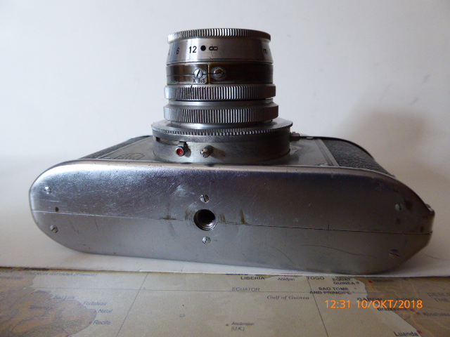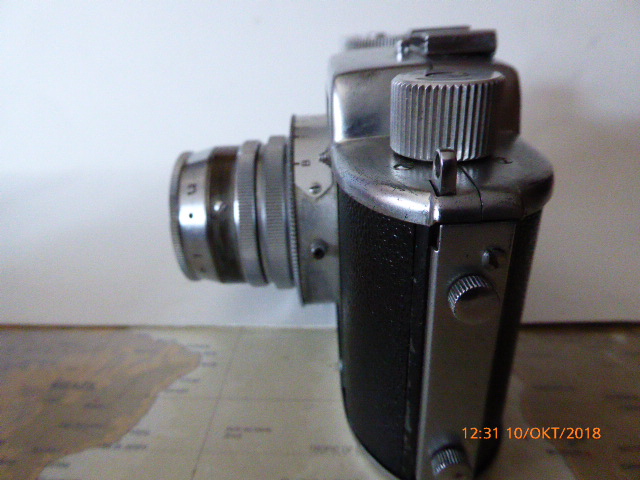 Und wohl als Alleinmerkmal für diese Reihe neben dem Objektiv ist ein kleiner Umstellhebel mit dem man entweder den rechten oder den linken Sucher totstellen kann als je ein Sucher für 50 mm und 75 mm.
