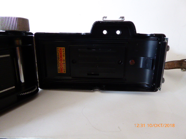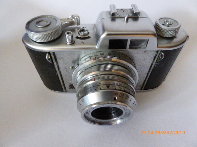 Verschluß Prontor SVS 1-1/300 sec und "B", im Gehäuse fest montiert. Belichtungsmessung keine Blitz Standard-Blitzfuß ohne Mittenkontakt, PC-Buchse, "X" und "M" umschaltbar Sucher Umkehr-Galilei-Sucher für 35mm-Objektiv, eingespiegelte Bildfeldrahmen für 50, 75 und 90mm-Objektive mit Paralax-Markierungen. Selbstauslöser mechanisch