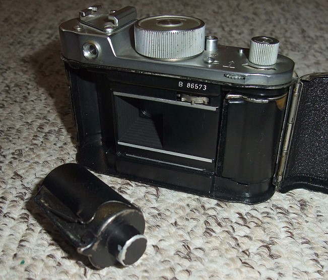 c)) Fertig geschnittene KB-Filme für ca 55 Aufnahmen auch Spulenkern für T-Patronen, umwickelt mit schwarzem Papier zur Bestückung im Tageslicht. Von z.B. Agfa mit Namen "Tageslichtspule für Kassettenbeschickung".