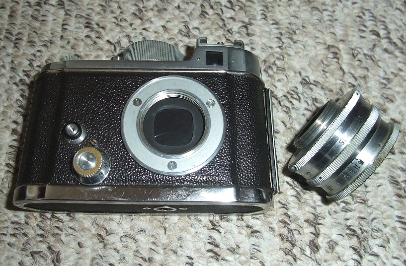 Objektiv: Wechselobjektiv mit Schraubgewinde. Lichtstarkes seltenes Rodenstock Heligon 1:1,9 f=4 cm. 0,6 Meter bis unendlich. Schärfentiefe-Tabelle. Das Heligon war wohl recht selten an der Kamera im Einsatz. es hat hier die Serien-Nr.: 2028147. Die Kamera wurde auch mit anderen Objektiven geliefert. Geeignet für Wechselobjektive unterschiedlicher Brennweiten. Das Gewinde passt zwar zu verschiedenen Filmkamera-Objektiven, ist aber optisch nicht verwendbar.