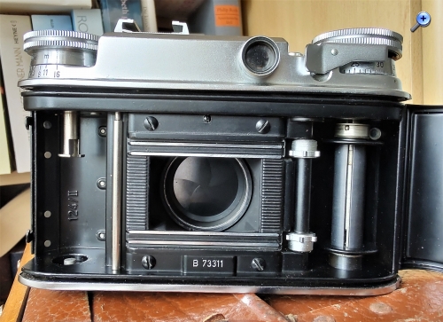 Die Kamera funktioniert nur mit eingelegtem Film. Bei meinem Modell muss man den Schnellspannhebel, wie z.B. bei der Paxette von Braun, zweimal betätigen, einmal für den Filmtransport, einmal zum Spannen. Beide Funktionen sind nicht gekoppelt.