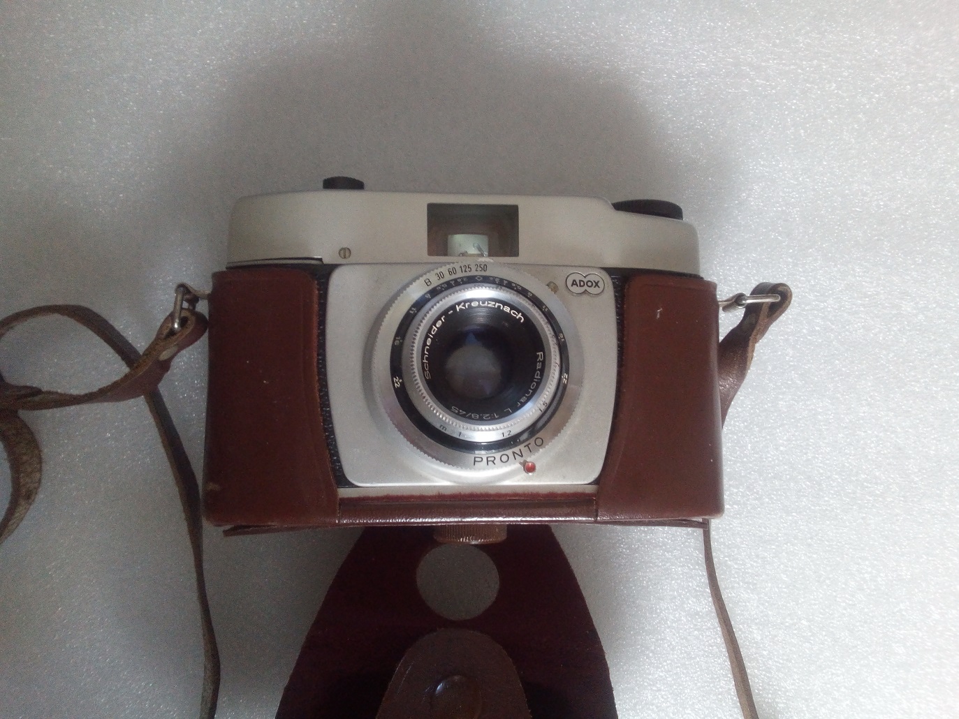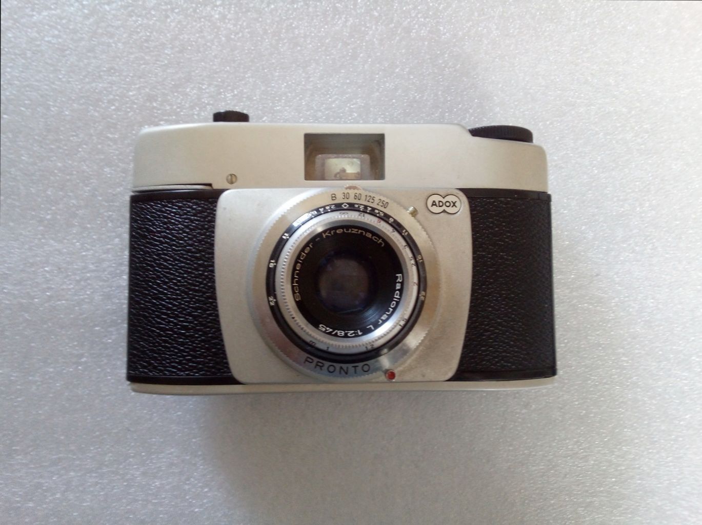 Hersteller: Adox Photowerke, Frankfurt am Main Typ: KB-Sucherkamera, 24 x 36 Baujahr: 1961 - 1964 Verschluß: PRONTO 1/30, 1/60, 1/125, 1/ 250 und "B" mit Selbstauslöser Objektiv: Schneider-Kreuznach, Radionar L 1:2,8 / 45 Blende: 2,8 - 22 Fokus: 1m - unendlich