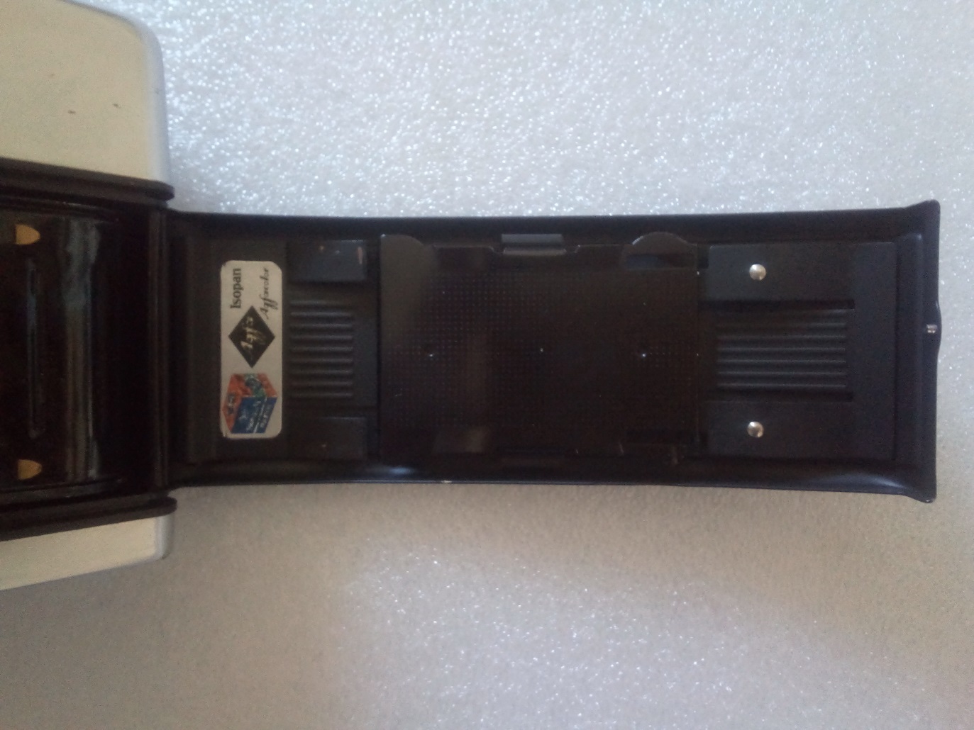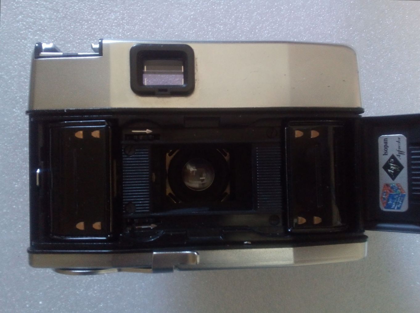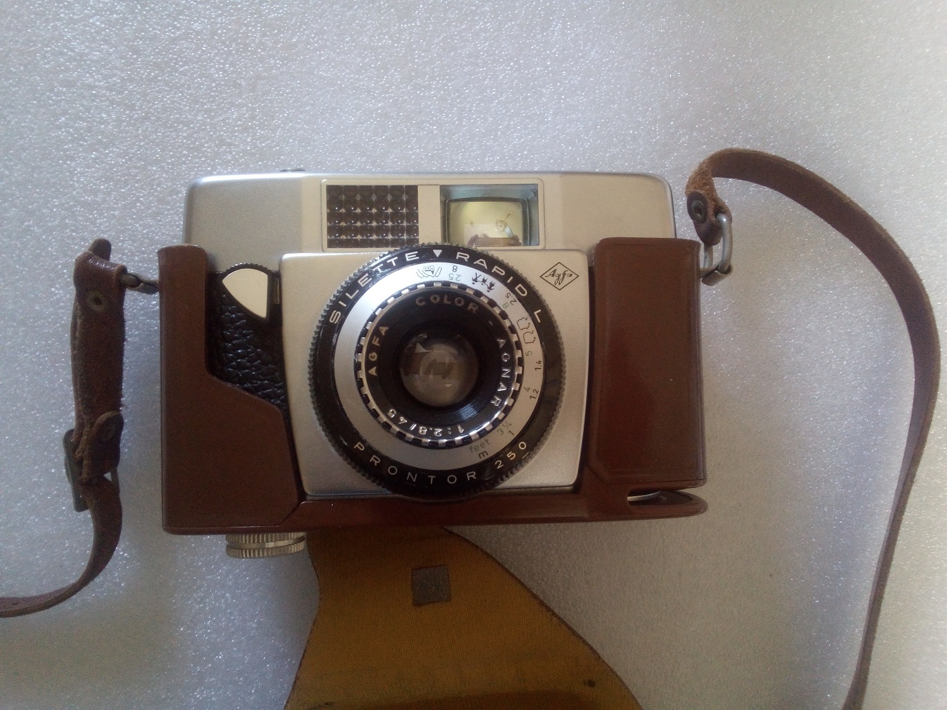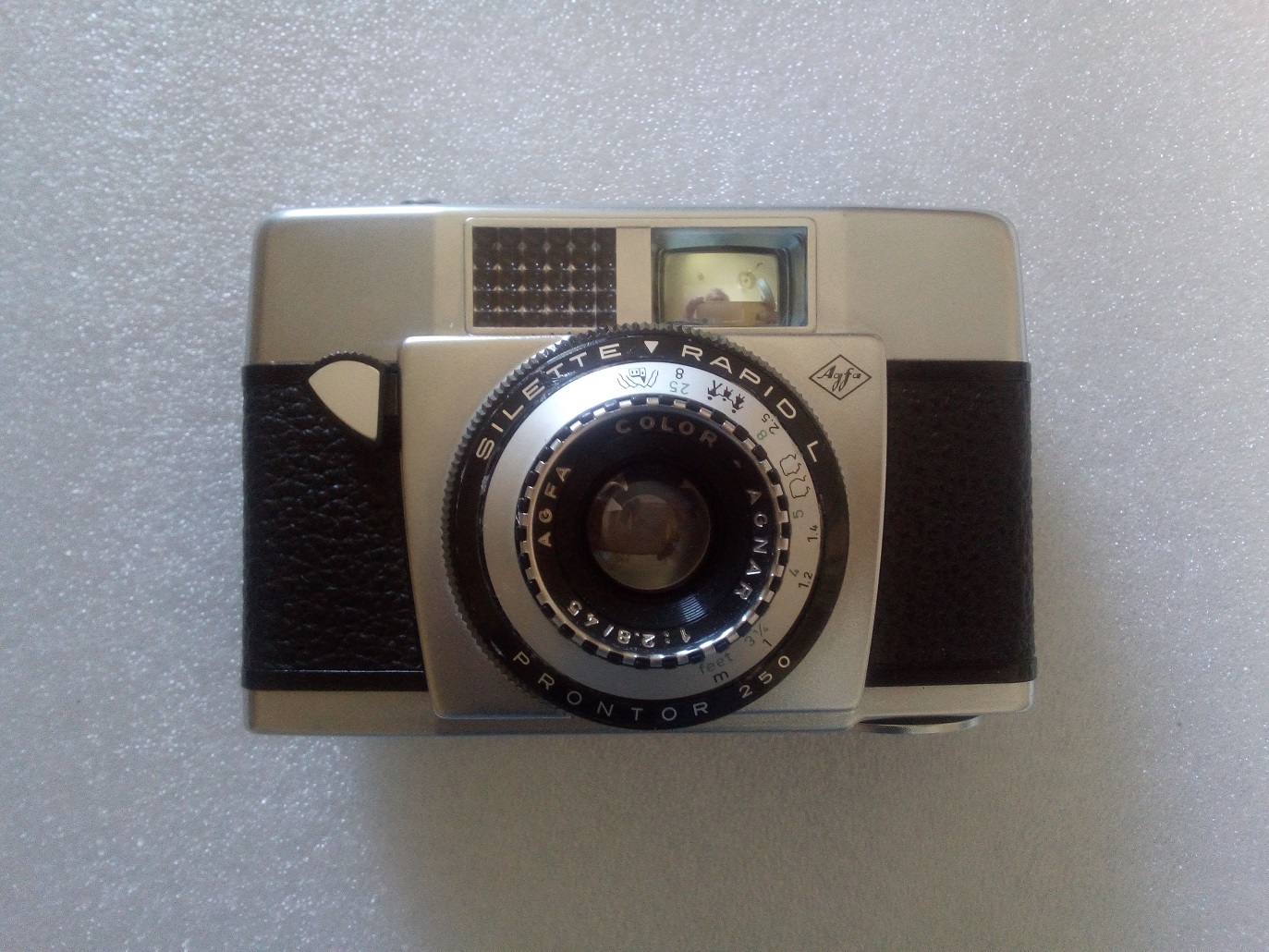 Hersteller: Agfa Kamera-Werke, München Typ: KB-Sucherkamera 24 x 36 mm, mit "Rapid" Patronen, 12 Aufnahmen und selenzellengesteuertem Belichtungsmesser Baujahr: 1964 Verschluß: Prontor 250 mit "B" und 1/30 - 1/250 sec Blenden: 2,8 - 22 und Lichtwerteskala Objektiv: Agfa Color-Agnar 1:2,8 / 45 mm Fokus: 1m - unendlich