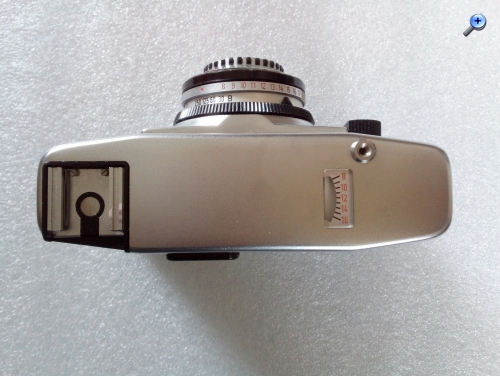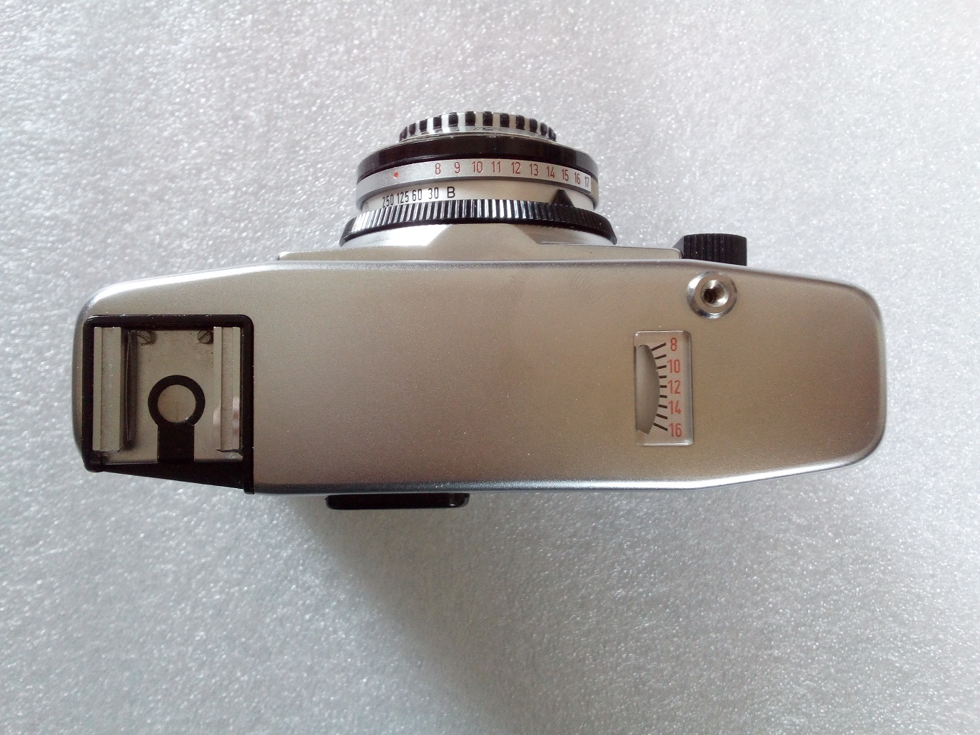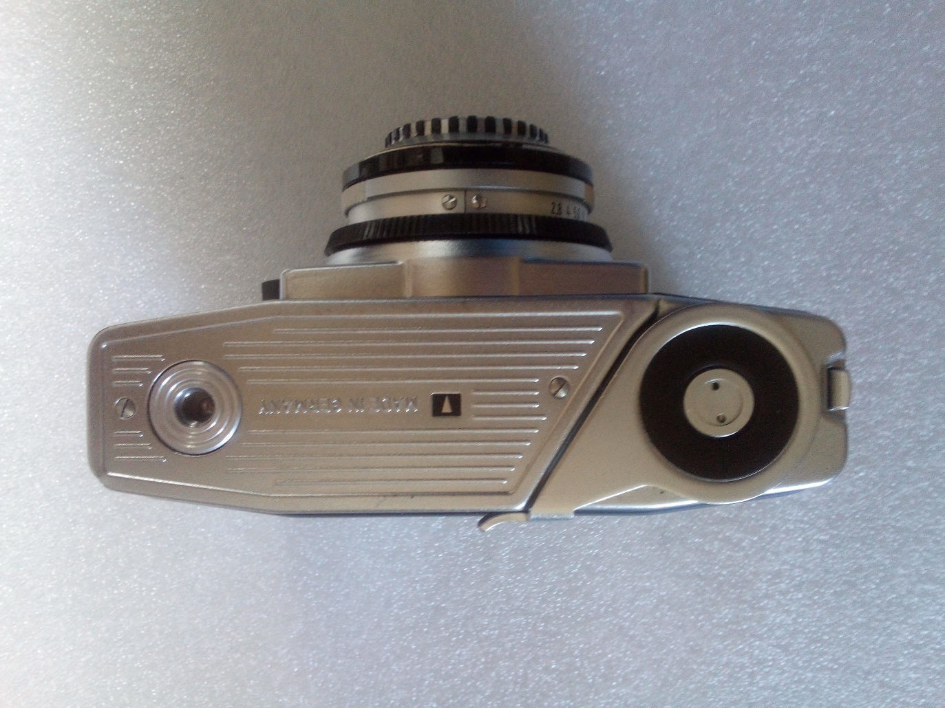 Auslösehebel an der Vorderseite rechts, auf der Oberseite Drahtauslöseranschluß, Skala für den Belichtungsmesser, Blitzschuh mit Mittenkontakt, Rückwand mit Filandruckplatte aufklappbar, an der Unterseite Schnellspannhebel, Filmzählwerk (springt beim Öffnen der Rückwand automatisch auf Anfang) Stativgewinde