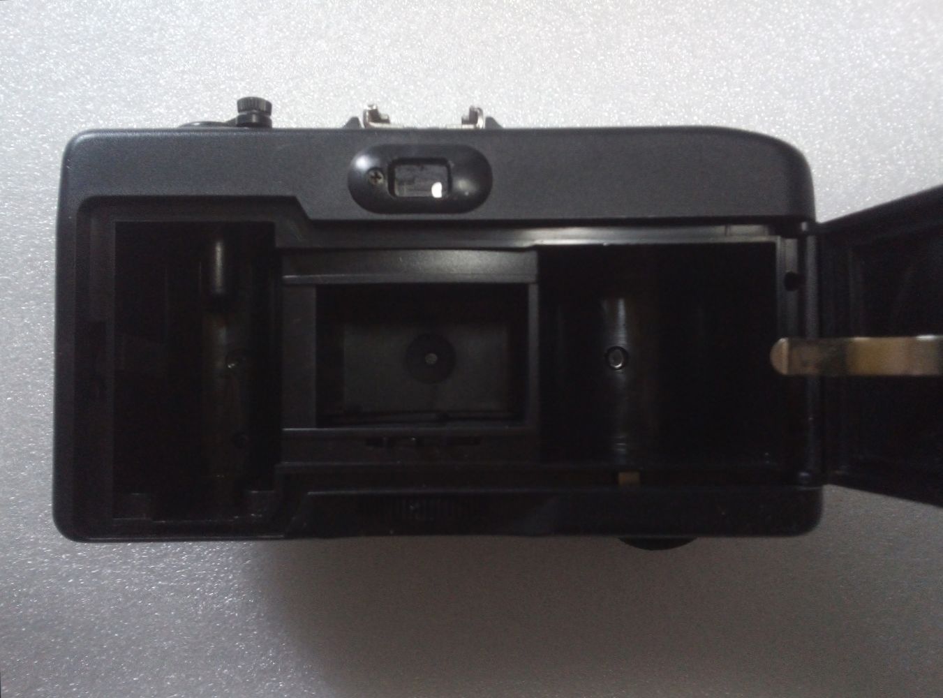Rückseite: Sucher, aufklappbarer Deckel, Drehrad für die Vorspulung
