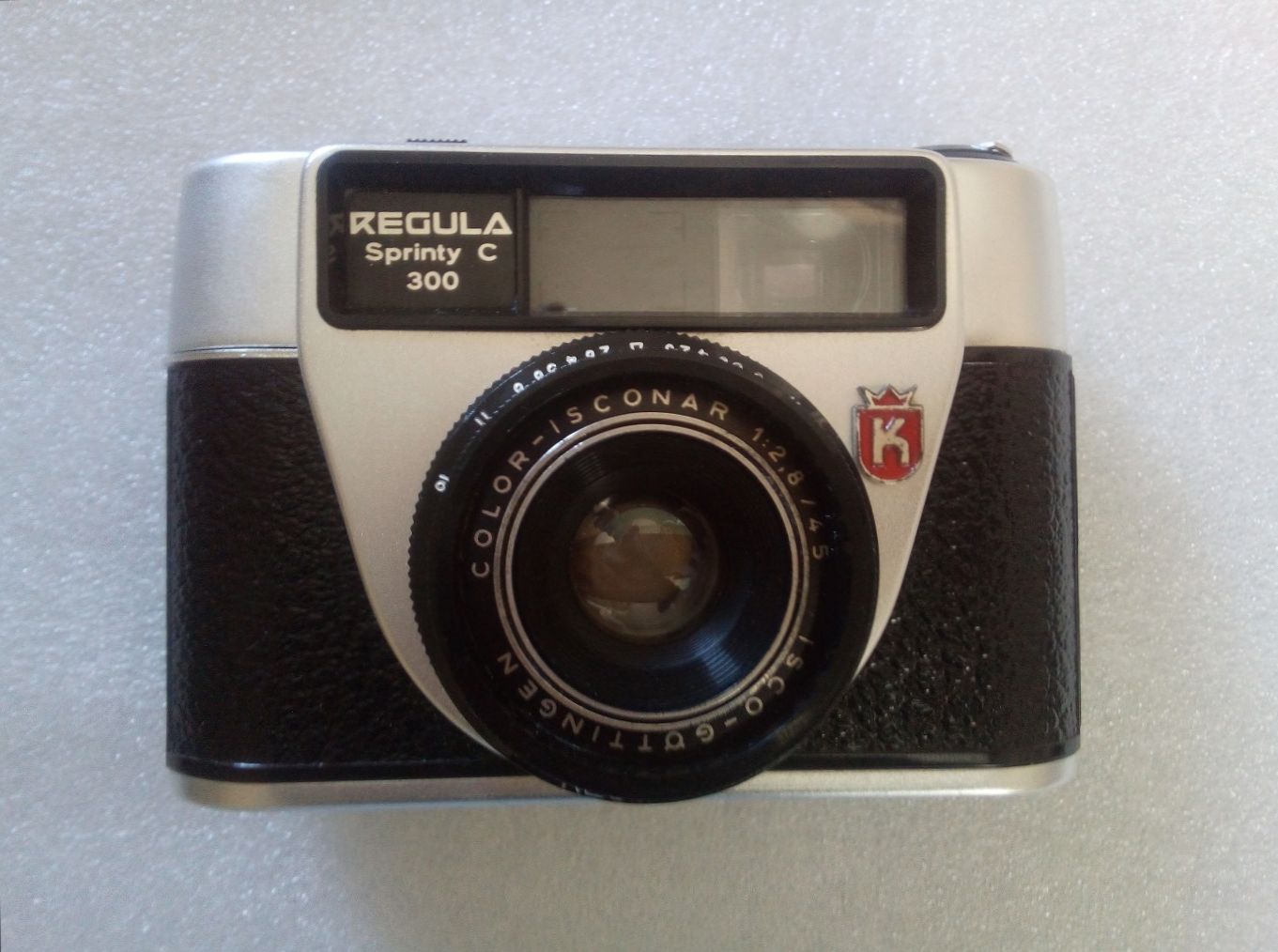 Die King Regula Sprinty C 300 kam 1970 auf den Markt und konnte mit ein paar Besonderheiten aufwarten. So erlaubt es der RECTAMAT Zentralverschluß nicht, Blenden und Verschlußzeiten unabhängig voneinander zu wählen, da diese in vier Gruppen zusammengefasst sind. Somit waren dem Benutzer enge Grenzen gesetzt. Zur leichteren Bedienung gibt es auch 3 Wettersymbole. Für "B" befindet sich auf der Rückseite der Kamera unter dem Sucherfenster einen kleinen Hebel (roter Kreis im Foto) der nach dem Spannen nach rechts verschoben werden muss. Desweiteren ist die Blende rechteckig. Interessant ist auch, dass je nachdem ob mit Elektronenblitz oder Blitzlichtlampe gearbeitet wird eine entsprechende Verstellung des Mittenkontaktes im Blitzschuh vorzunehmen ist. (Symbol BLITZ bei Elektronenblitz und Symbol LAMPENBIRNE für Blitzlichlampe). Der Name SPRINTY soll sich aus der max. Verschlussgeschwindigkeit von 1/300 sec. abgeleitet haben.
