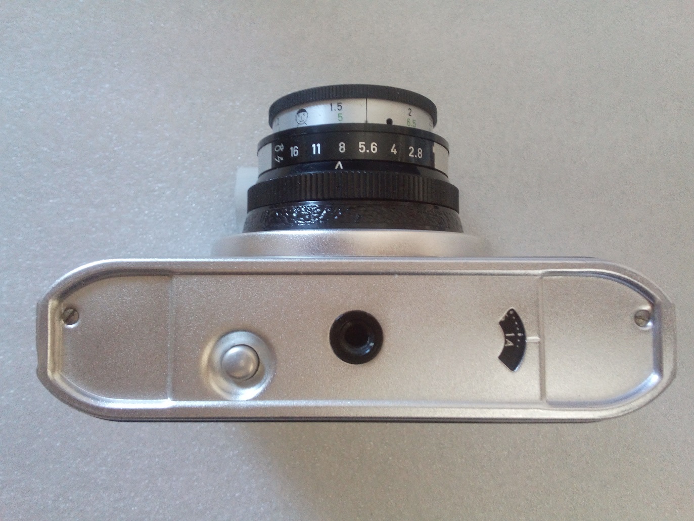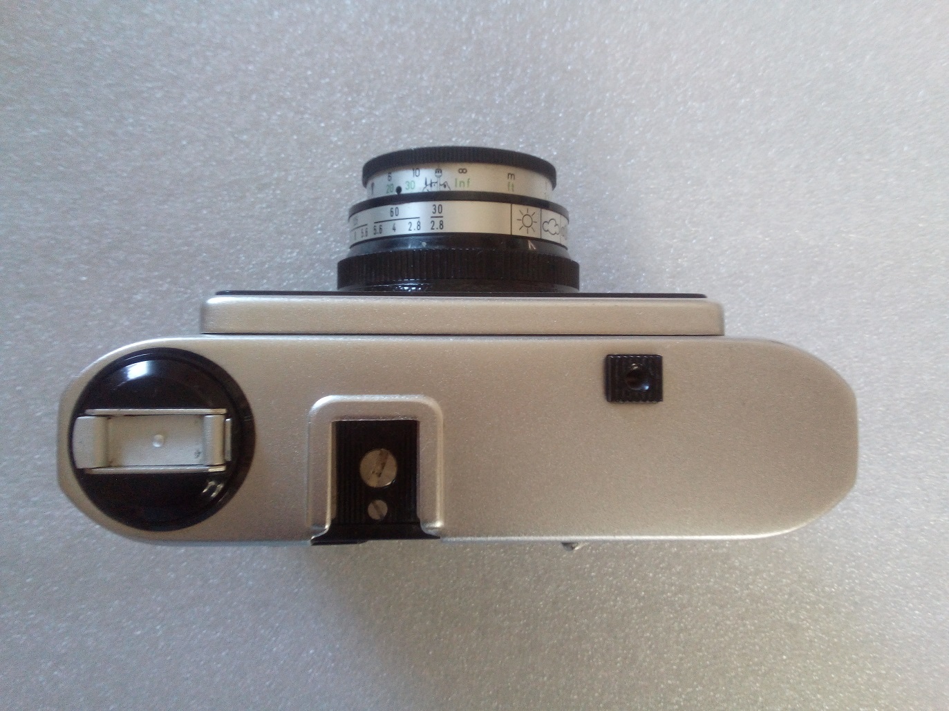 Oberseite: Auslöser aus Kunststoff, Blitzschuh mit Mittenkontakt und Umschaltmöglichkeit, Filmrückspulkurbel