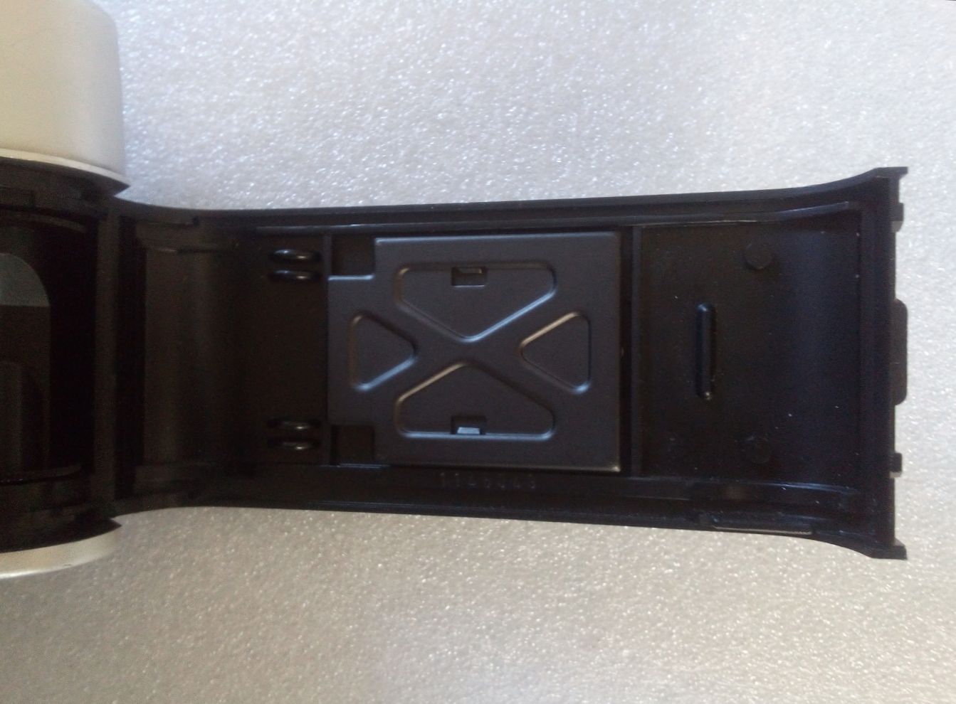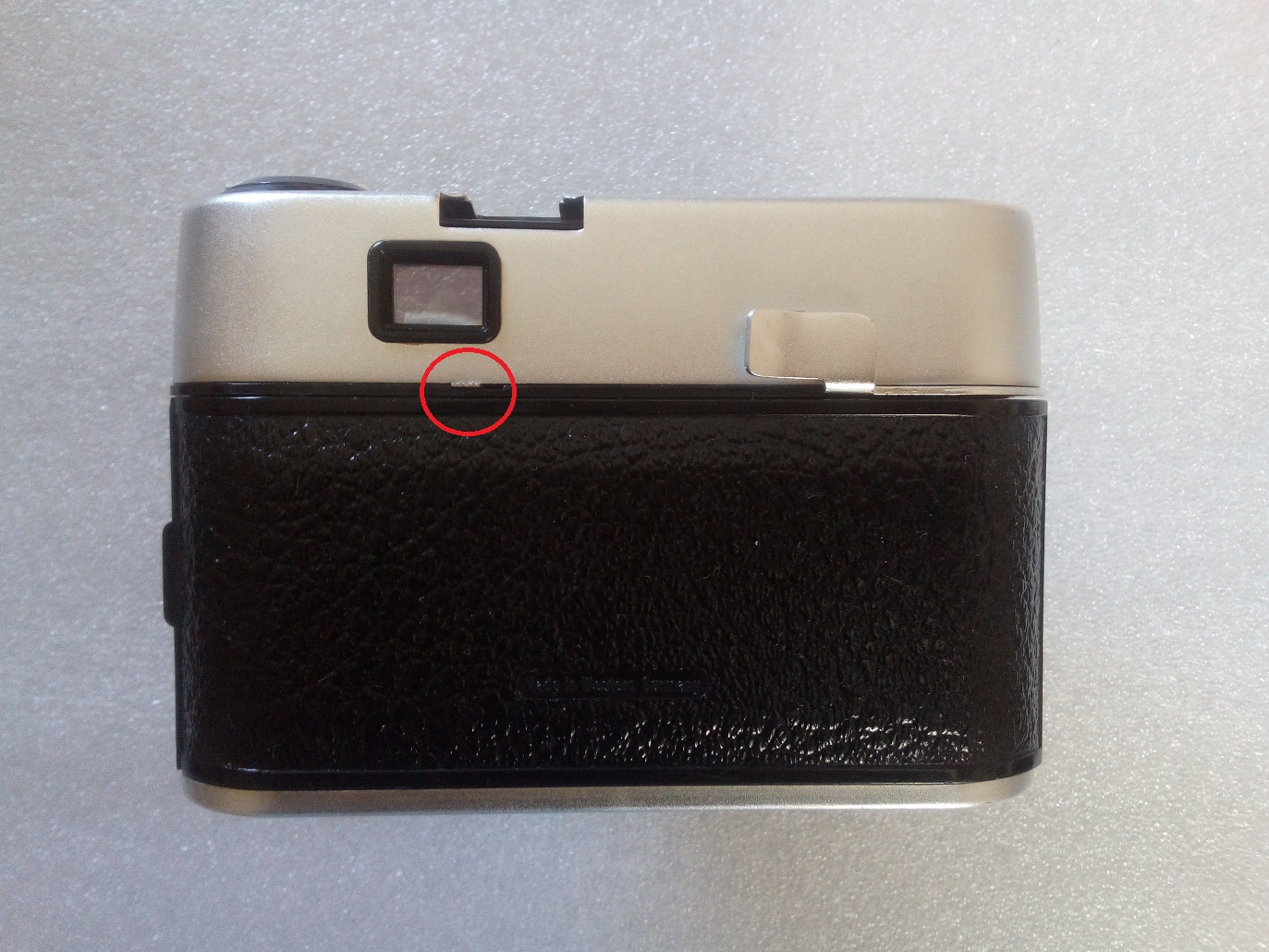 Unterseite: Filmzählwerk (springt beim Öffnen der Rückwand automatisch auf "A"), Stativgewinde, Entsperrknopf für die Filmrückspulung