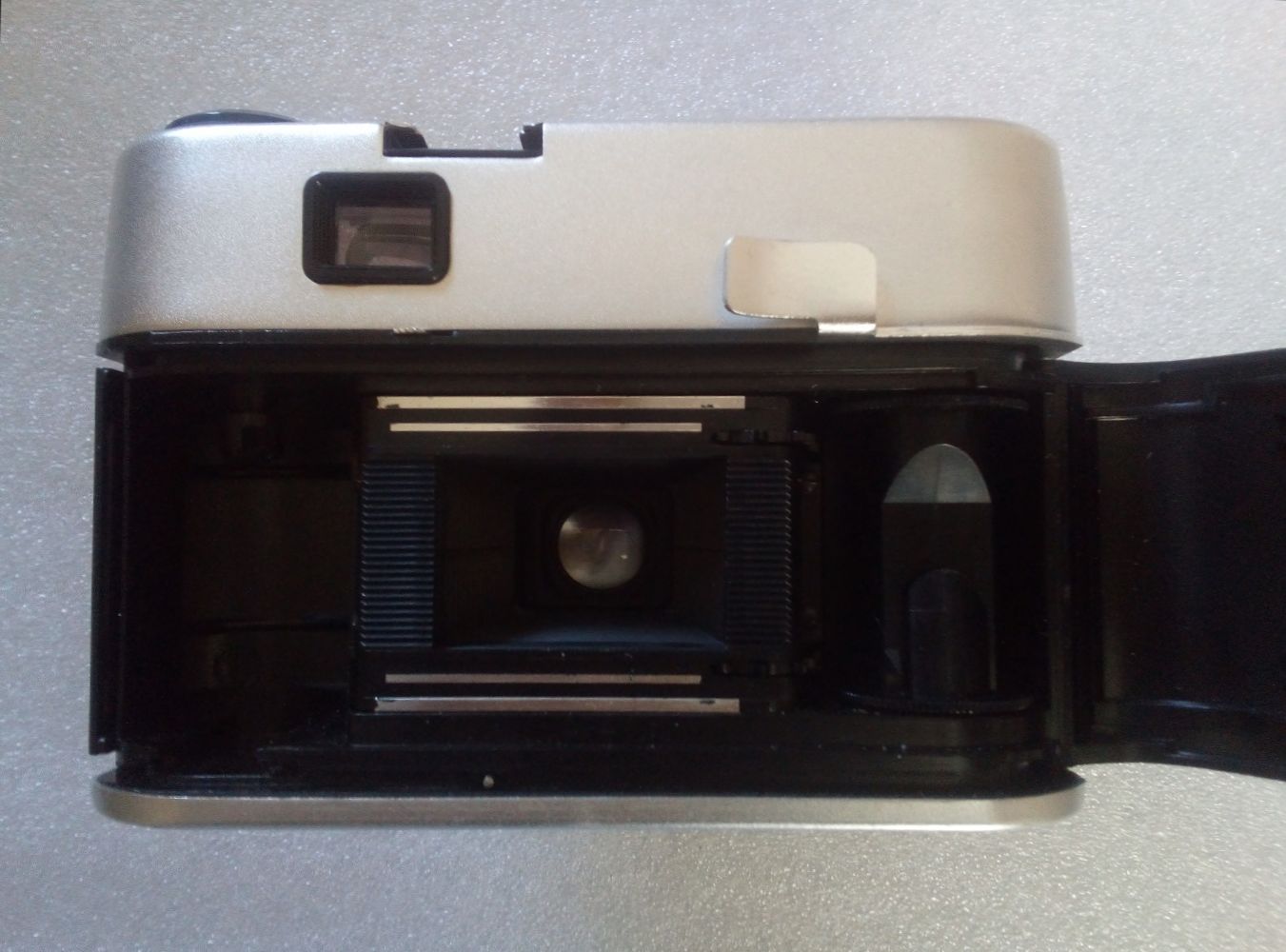 Rückseite: Schnellspannhebel, Sucherfenster, Hebel für "B", aufklappbare Rückwand mit Filmandruckplatte
