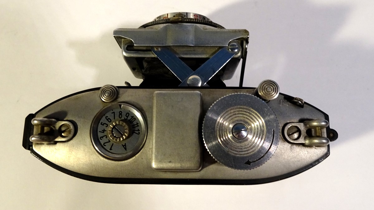 Belichtungssystem: T (Hilfshebel), B, 1 bis 1/500 Sek. (Relativ seltene Variante), Vorspannhebel
